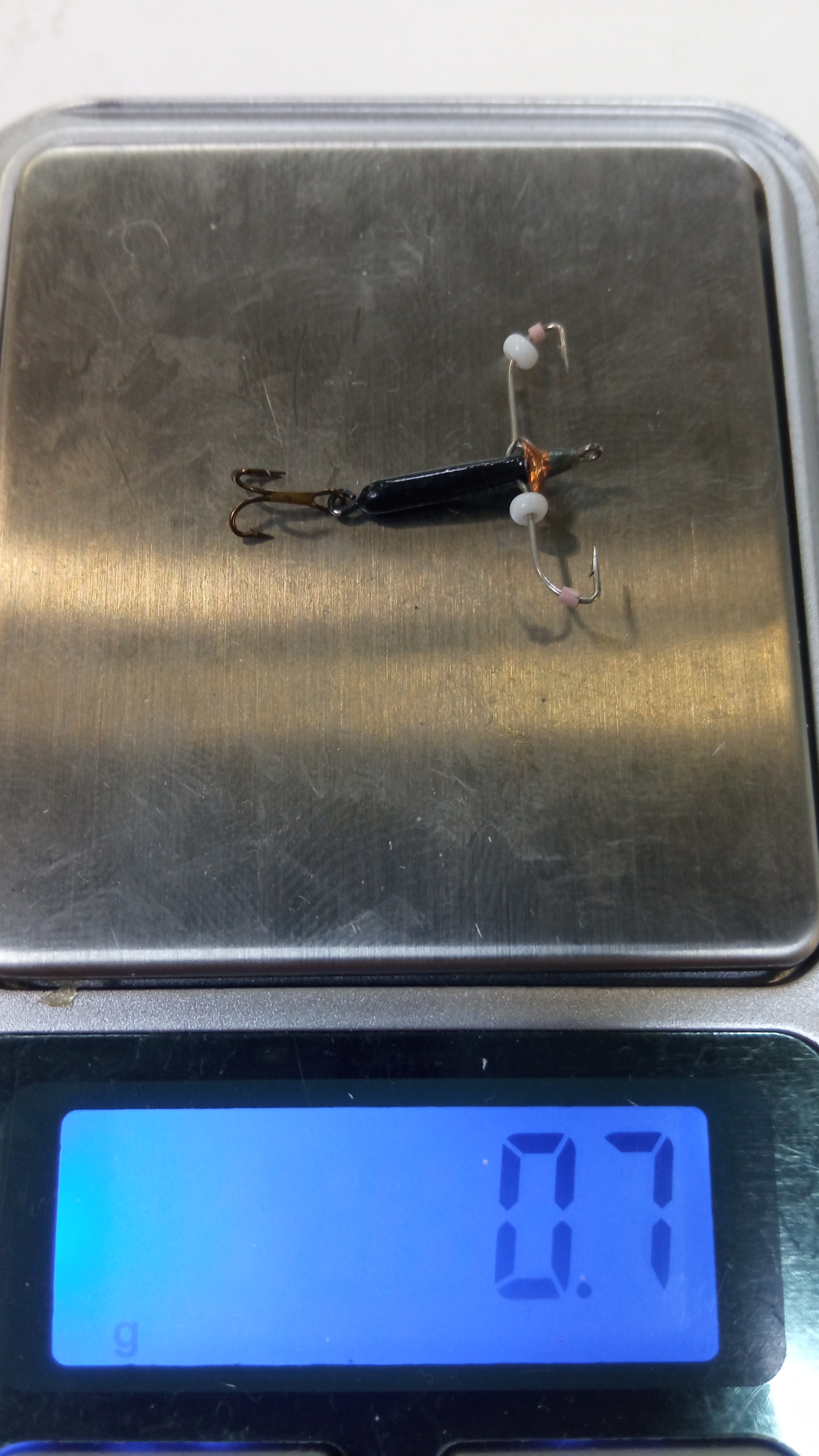 Мормышка очень напоминает личинку стрекозы, маленькая, красивый вид и очень хорошая игра. Мои весы показали вес в 0,7 гр. Тягал окуней один за одним. Очень рабочая мормышка. Крючки хорошие, тройничек на мой взгляд чуть маловат, но это уже дело вкуса каждого. Главное ловит, а остальное не важно.