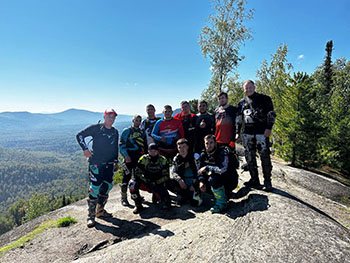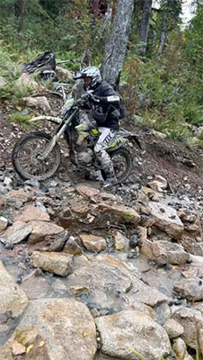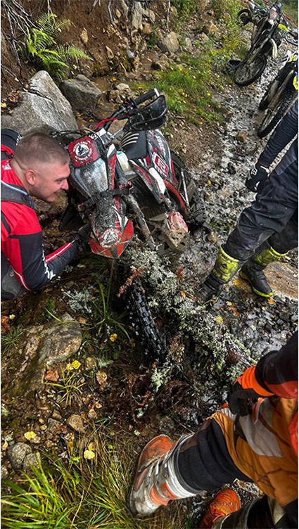 Самым сложным оказался последний рывок на вершину — около 40 метров крутого подъема с сыпучим грунтом и массивными камнями. Эти метры мы шли 4 часа, двигаясь со скоростью примерно 10 метров в час! Мне удалось забраться первым, после чего я пошел помогать остальным. В итоге, с помощью троса, я затащил на вершину еще 7 мотоциклов.