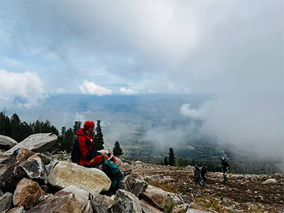 Ночь и все утро лил дождь, из-за чего выезд пришлось перенести на час. Нашей главной целью во второй день был подъем на самую высокую точку Шерегеша — гору Мустаг (1570 метров), известную своим крутым уклоном на вершине.