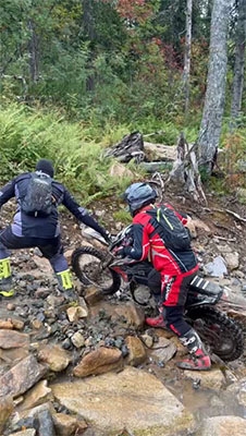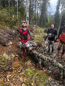 Начали мы бодро, успешно преодолев первые два каменистых участка. Затем на пути оказалось огромное поваленное дерево. Все объезжали его справа, и я последовал их примеру. Но на скользком камне мой мотоцикл занесло прямо к этому дереву, и он встал клином между его ветвями. К счастью, из-за невысокой скорости обошлось без серьезных повреждений. Распилив часть дерева, мы освободили байк и двинулись дальше.