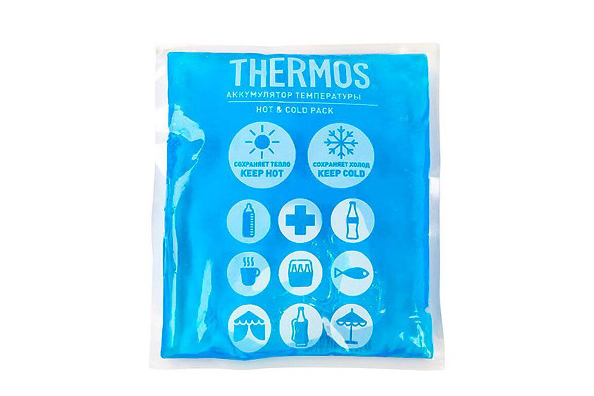 Мягкий и гибкий аккумулятор температуры Thermos Gel Pack отличается универсальностью и может работать длительное время в двух режимах - «тепло» или «холод». Благодаря малому весу и компактным размерам Gel Pack можно использовать в небольших термосумках, а также в аптечках и термокосметичках. Аккумулятор отлично подойдет для поддержания низкой температуры для сохранения продуктов, напитков и детского питания в жару, или защитит их от переохлаждения в зимнее время года. В терапевтических целях аккумулятор может служить в качестве компресса – холодного или теплого.