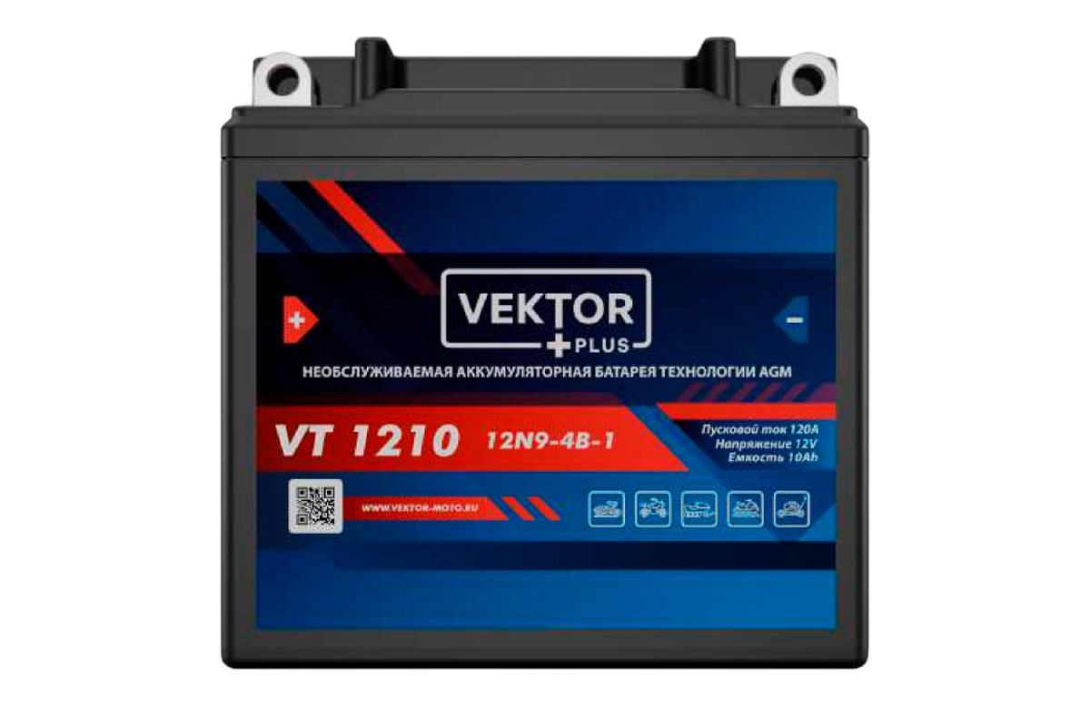 Аккумуляторная батарея VEKTOR PLUS VT 1210 — свинцово-кислотный источник питания для мототехники. Изделие изготовлено по технологии AGM и имеет герметичную конструкцию. Номинальное напряжение составляет 12 вольт. Батарея относится к категории необслуживаемых. Оригинальные коды производителя — 12N9-4B-1, YB9A-A, YB9-B.