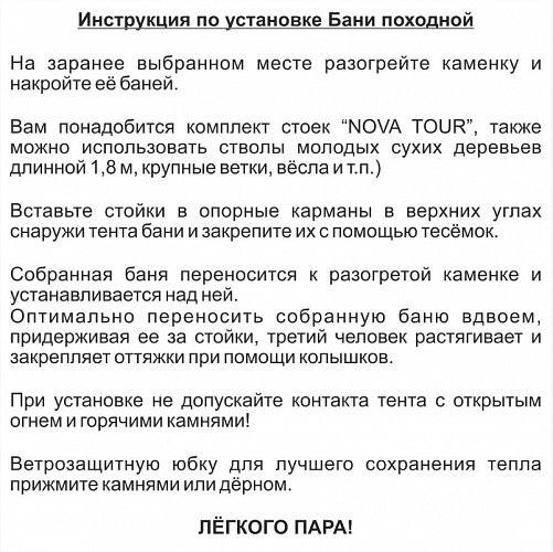 Компания Нова Тур позаботилась о Вашем комфорте и благополучии и создала незаменимую палатку-баню с непревзойденными качествами! Походная “Баня N” производства Нова Тур устанавливается в любом удобном для Вас месте за считанные минуты. Причем не нужно тащить с собой до места сложный и массивный каркас, в качестве стоек можно использовать добытые прямо по месту стволы деревьев длиной на15-30 см больше высоты бани, для того, чтобы надежно вбить их в землю над заготовленным заранее очагом. Желательно дополнительно раскрепить каркас походной бани диагоналями для большей прочности. Для организации походной каменки внутри предусмотрена огнеупорная накладка. Во избежание поддуваний походная баня имеет ветрозащитную юбку по всему периметру, а для обеспечения особого комфорта имеются прозрачные окна на стенках. Вот так, без особых усилий и затрат можно организовать необходимые удобства в походных условиях.