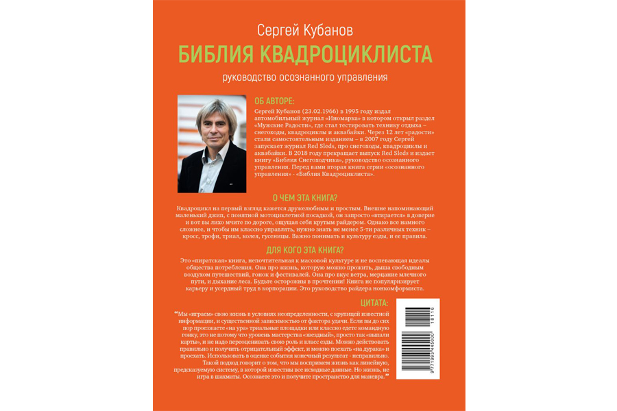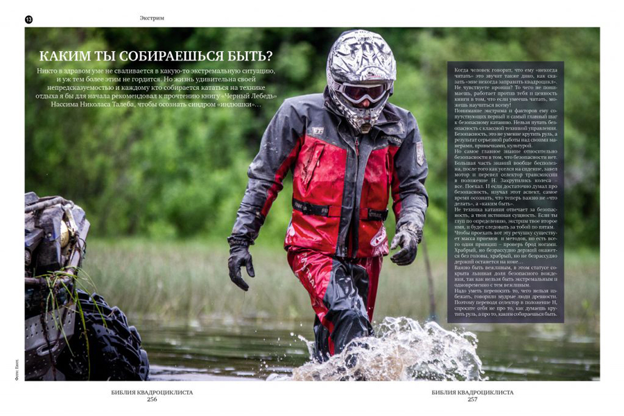 Большой блок по технике езды – колея, трофи, крутые берега, триал, кросс-кантри. Анализ несчастных случаев и почему они не случайны. Неожиданно нарисовались главы про детей и той роли, которую в их воспитании может сыграть ATV, про тренды и прототипы «квадров» завтрашнего дня, про полезные иностранные выставки и про цифровые СМИ и блогеров достойных внимания. Широко и красиво верстается глава про места катания - от Казахстана и Сибири, до Кольского и Крыма.