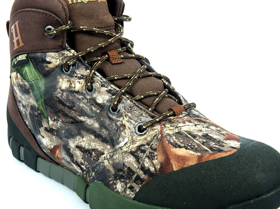 Ботинки НАRКLA LYNX GТХ 6' камуфлированной расцветки Mossy Oak New Break-Up-бесшумные облегчённые ботинки для охот скрадом в тёплое время года. Ботинки такме легкие а их колодка настолько удобная, что создаётся ощущение ходьбы босиком. Верх ботинок комбинированный и выполнен из искусственной кожи и бесшумного синтетического материала Tietex@.