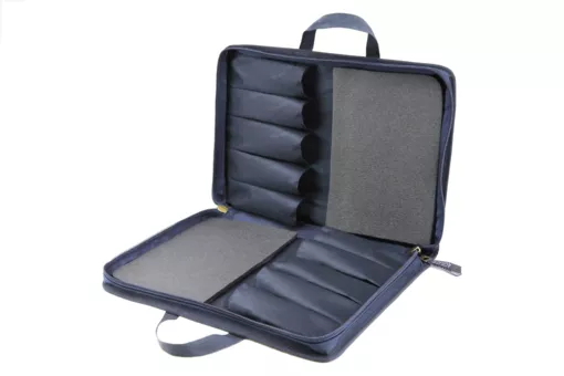 Чехол выполнен из прочного непромокаемого материала, имеет надежную двухстороннюю молнию и двойную ручку из стропы для переноски. Вмещает до 10 удочек длиной до 380 мм. На каждой стороне чехола для зимних удочек расположены по 5 отделений из нейлона для фиксации удилищ и мягкие вставки из пены для сохранности хлыстиков.