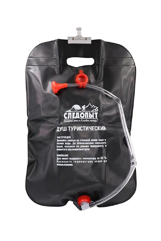 Душ туристический Следопыт PF-TE-02 состоит из герметичного резервуара с емкостью, эластичной трубки с водорегулирующим клапаном и насадки-лейки с небольшим рассекателем воды. Емкость интенсивно черной расцветки. На солнце вода в резервуаре очень быстро нагревается, что дает возможность принимать душ в температурном комфорте. Походный душ изготовлен из прочного нетоксичного материала ПВХ, снабжён распыляющими соплами. Объём 20 литров.