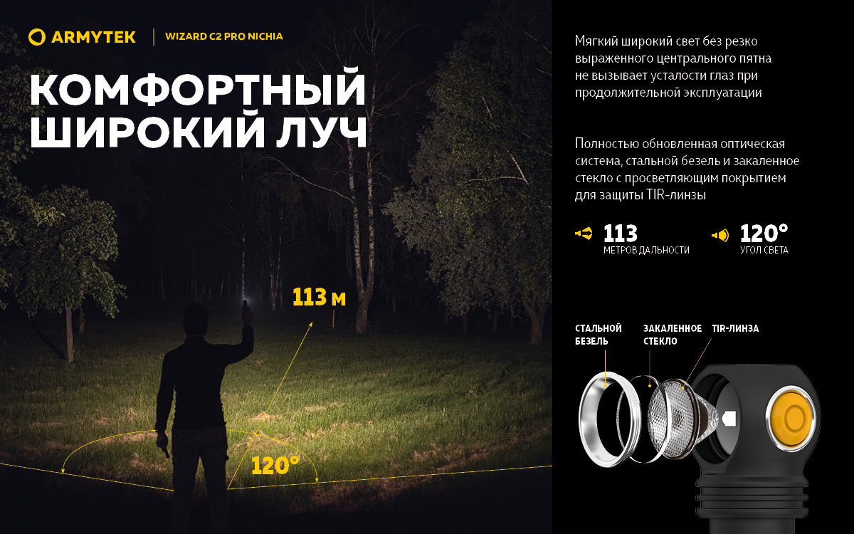 - Комфортный широкий луч полностью обновленной оптической системы, TIR-линза защищена от царапин закаленным стеклом с просветляющим покрытием.