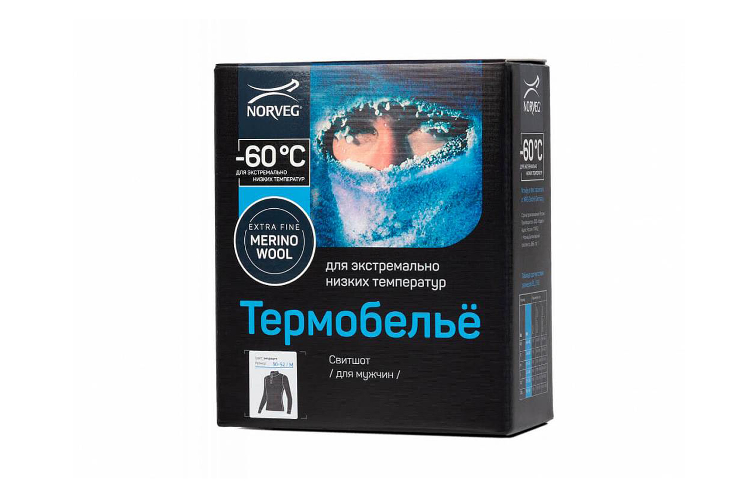 В условиях пребывания на открытом воздухе при экстремально низких температурах требуется особое, специально разработанное для морозов, термобелье, максимально сберегающее тепло и не стесняющее движений. Особенностью материала фуфайки NORVEG "-60" является то, что при значительной толщине трикотаж с большим количеством «воздушных камер» между шерстяными волокнами остается эластичным и легким. Фуфайка из чистой мериносовой шерсти обеспечит двойную защиту: от холода и от влаги как следствия перегрева при движении. Шерсть мериносов гипоаллергенна, антибактериальна, изделия из нее не колются, очень легки и мягки на ощупь. Она также обладает свойством терморегуляции, т.е. аккумулирует тепло только до комфортного уровня, предотвращая перегрев. Волокна шерсти, впитывая влагу, постепенно отводят пот от кожи, оставаясь сухими на ощупь.