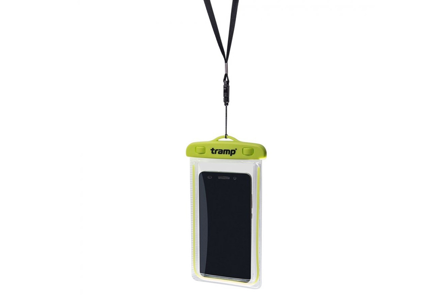 Влагозащитный чехол для мобильного телефона Tramp TRA-211, оптимален для телефонов с экранами 4,6-6 дюймов. Флюоресцентный яркий цвет, шнурок на шею.