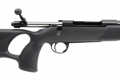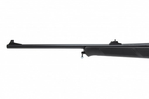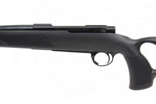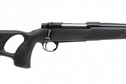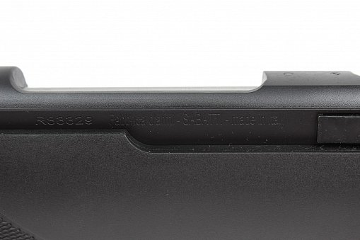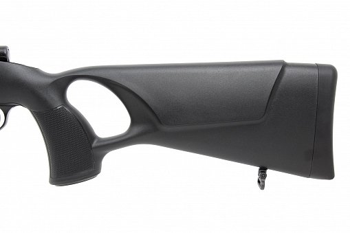- Ложа: Из прочного армированного полимера с пистолетной рукоятью и отверстием для большого пальца (THUMBHOLE). Резиновый затыльник смягчает отдачу, а насечки на ложе предотвращают скольжение рук при стрельбе.