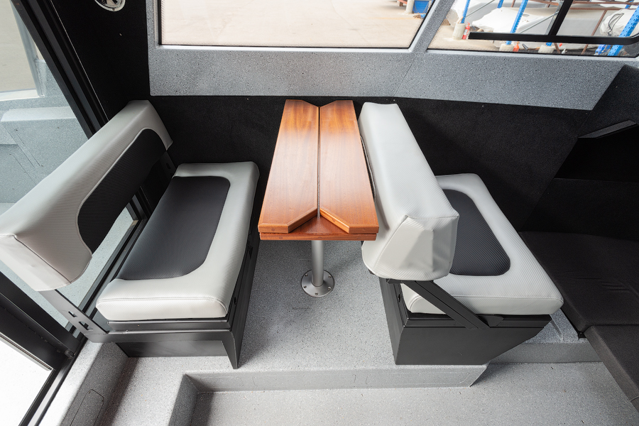 Мягкий салон выполнен в улучшенной серии «LUX», а отделка на борту — из натурального дерева «Natural Wood» для повышения уровня комфорта и статуса лодки.