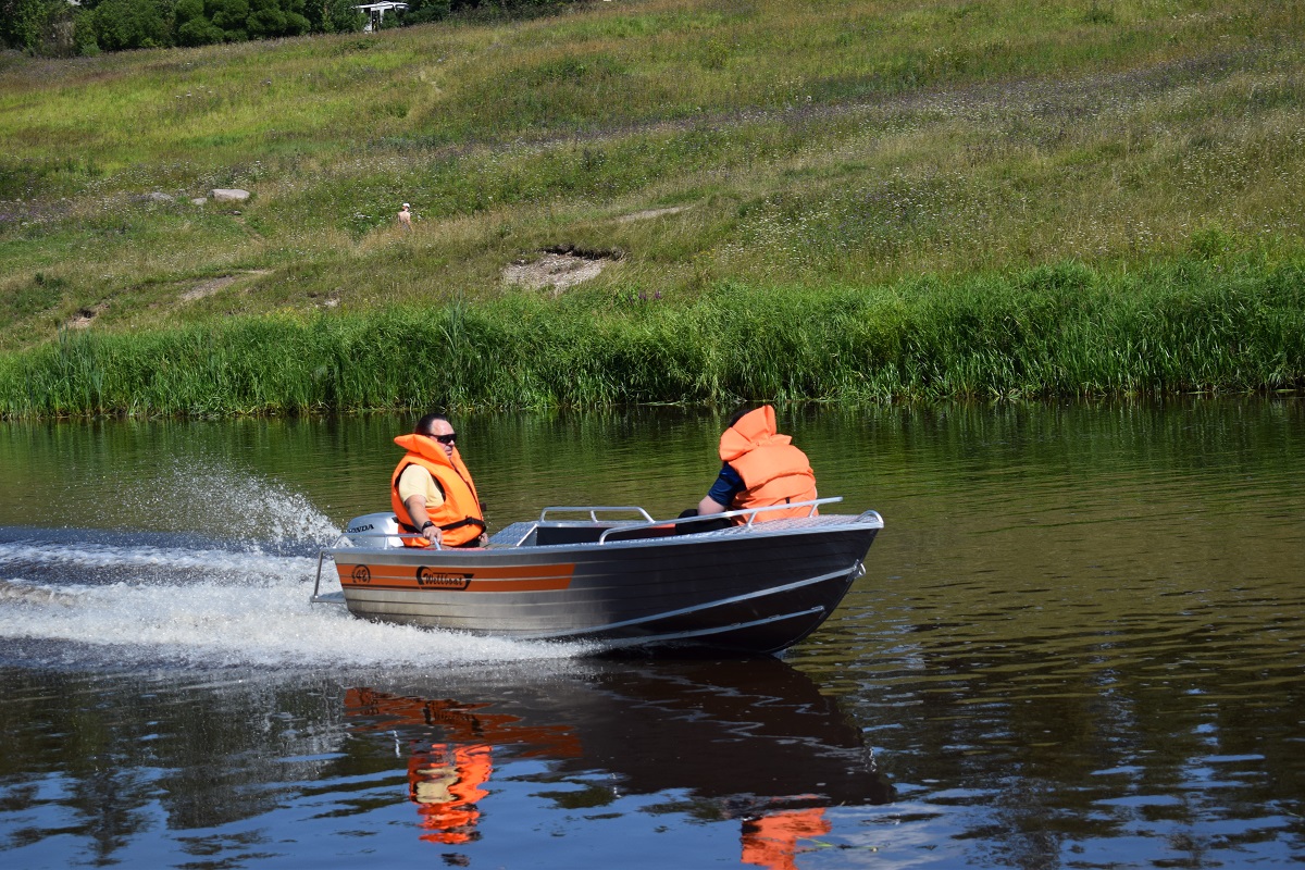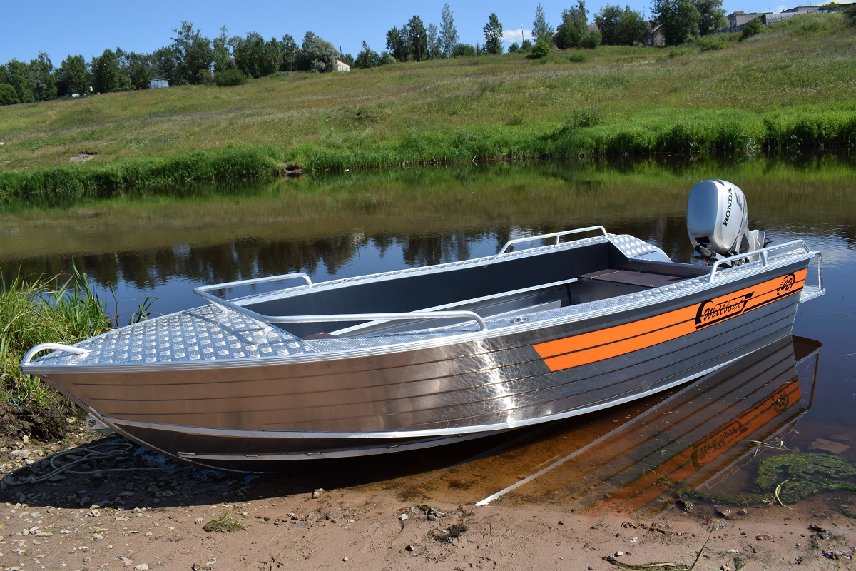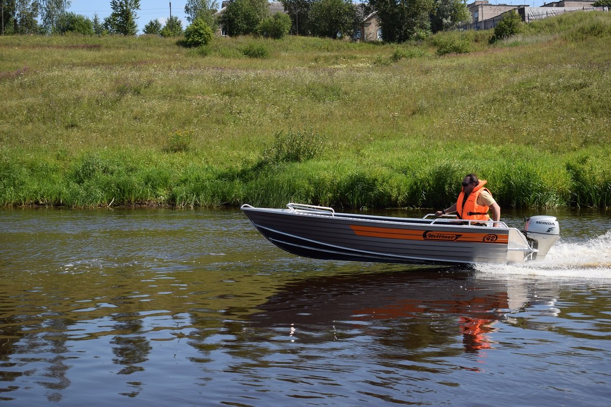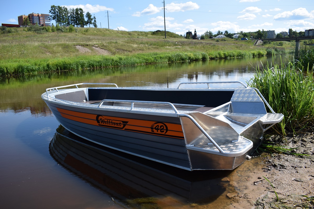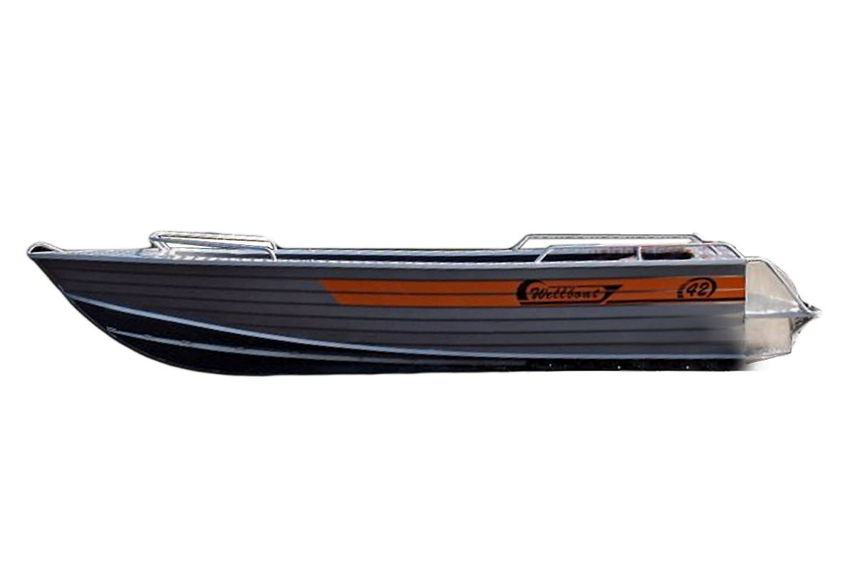 - Моторная лодка средних размеров, Wellboat-42 имеет умеренную килеватость (13 градусов на миделе, 8 градусов на транце) и подходит для рыбалки и отдыха на крупных озёрах и широких реках. В лодке с комфором могут стоя расположиться два рыбака. Толщина обшивки дна - 3 мм, бортов - 2 мм. Транец рассчитан под бензиновый мотор мощностью до 20 л.с. вроде Tohatsu M18 S, но лодка уверенно выйдет в режим глиссирования с двумя пассажирами даже под мотором в 9.9 л.с., например, Yamaha F9.9 JMHS.
