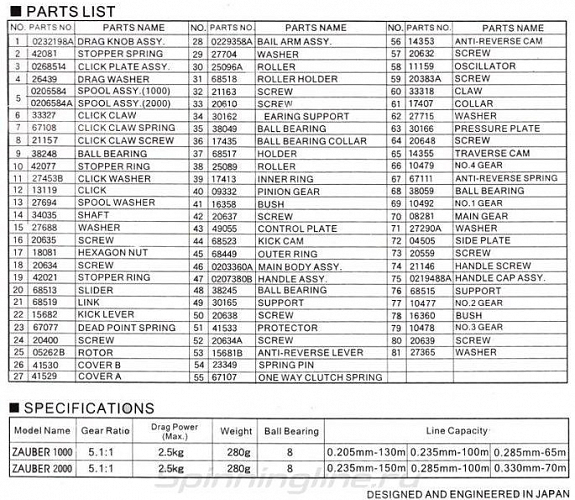 Одними из первых безынерционных катушек, которые стали очень популярными среди отечественных спиннингистов, были катушки из серии Zauber от компании Ryobi. Четыре модели, входящие в эту линейку, отличаются сравнительно небольшой массой (от 280 до 315 гр) и обладают передаточным числом равным 5.0 или 5.1:1. Надежность корпусу и основным деталям придает применяемый при производстве металл. Но самое главное - Zauber отличается плотной и ровной укладкой шнура, что достигается за счет использования механизма с "бесконечным" винтом и системой замедленной осцилляции. Добавим сюда установку 8 подшипников, обеспечивающих мягкий ход. Все это сделало данную серию чрезвычайно известной у рыболовов. Металлическая шпуля облегчена за счет перфорации и имеет бортик с покрытием из твердого сплава. Лесоемкость (зависит от модели) составит 65-200 м лески 0,285 мм. Фрикцион передний, с эластичной прокладкой, предотвращающей попадание воды. Максимальные нагрузки для тормоза составляют 2.5 или 5 кг. Также предусмотрены анти-реверс, складная ручка с прорезиненным кнобом и переключатель реверса. Комплектуется регулировочными шайбами.