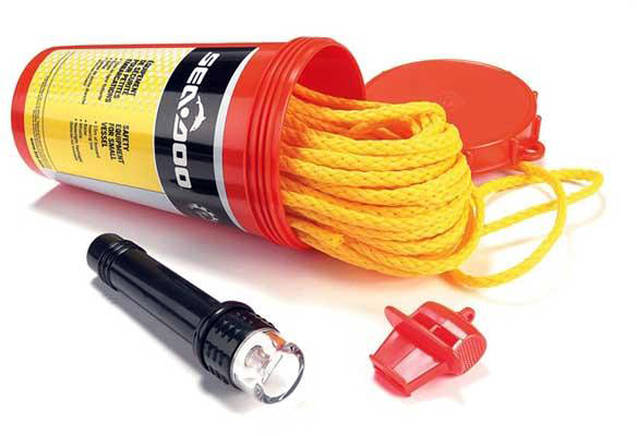Набор аварийно-спасательного оборудования. В данный комплект входит: плавучий конец длиной 15 м, водоотливная лейка, свисток и водонепроницаемый фонарик.