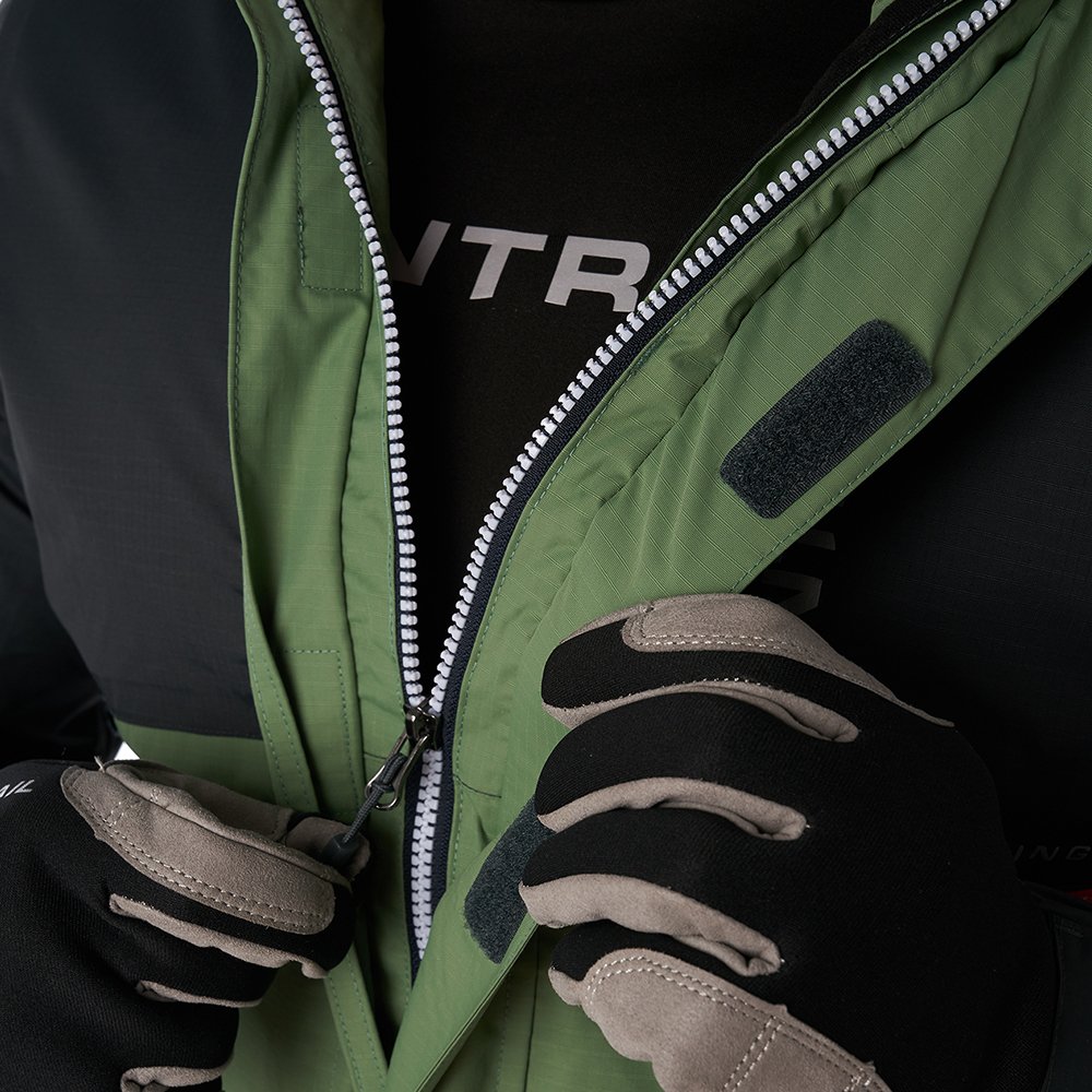 Центральная двухзамковая влагозащитная тракторная молния устойчива к грязи и защищена клапаном на липучках.