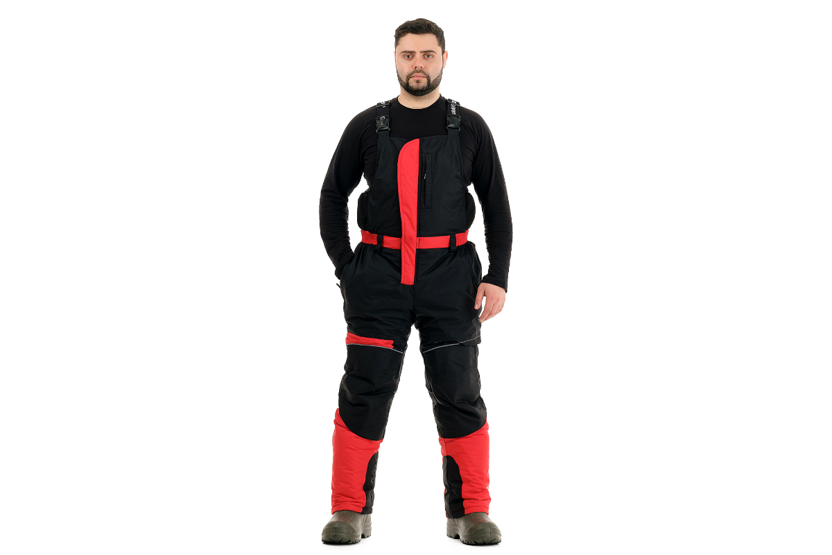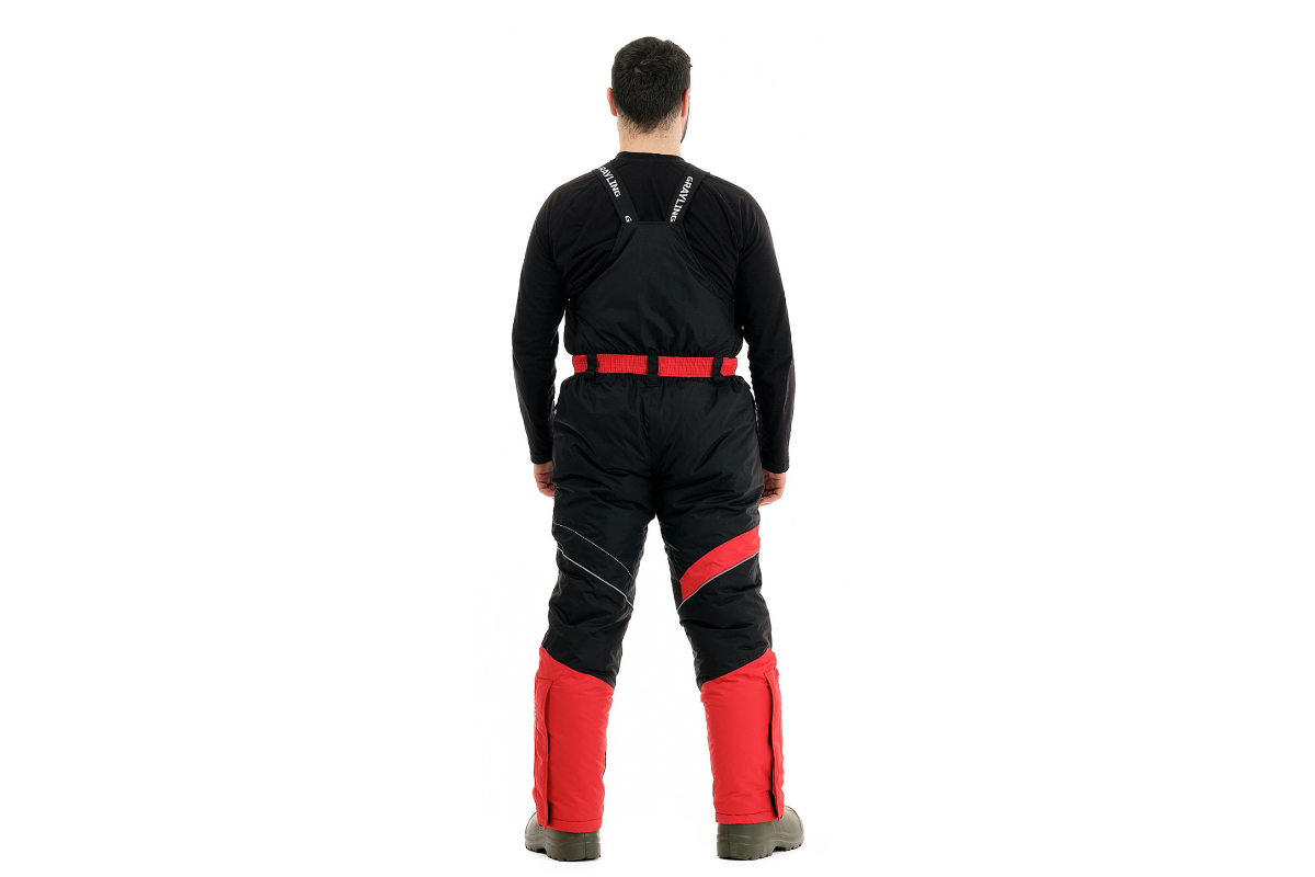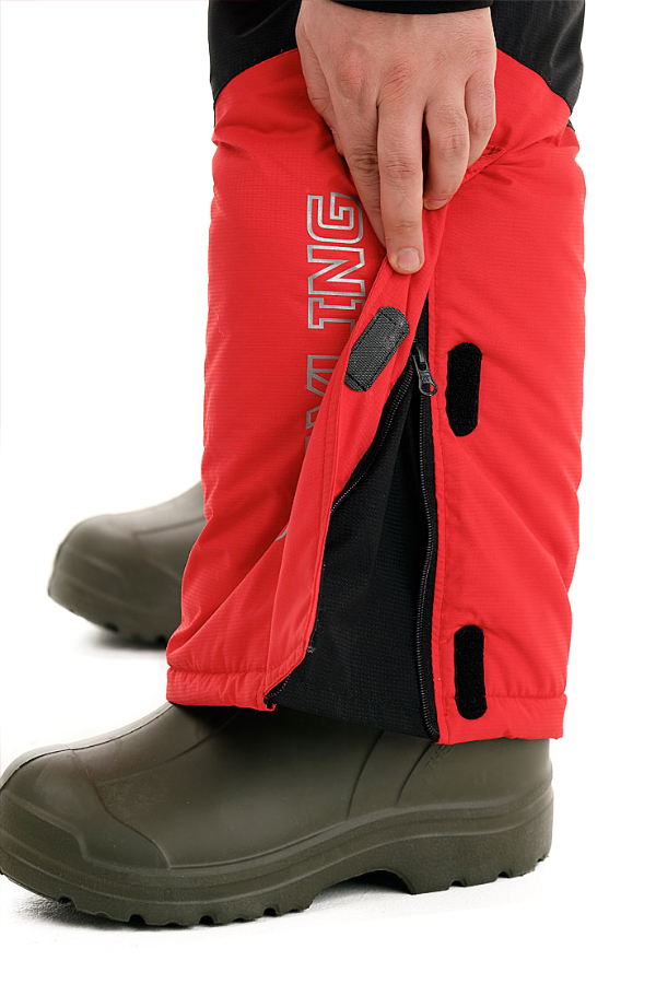 - Снегозащитные манжеты со стопорной резинкой. Низ брюк можно увеличить за счет вставок по бокам на молниях и планках с липучками. На правой брючине предусмотрен карман под шабалку. В области колен изолоновые вставки с анатомическими защипами. Низ брюк усилен. Полукомбинезон дополнен светоотражающим кантом.