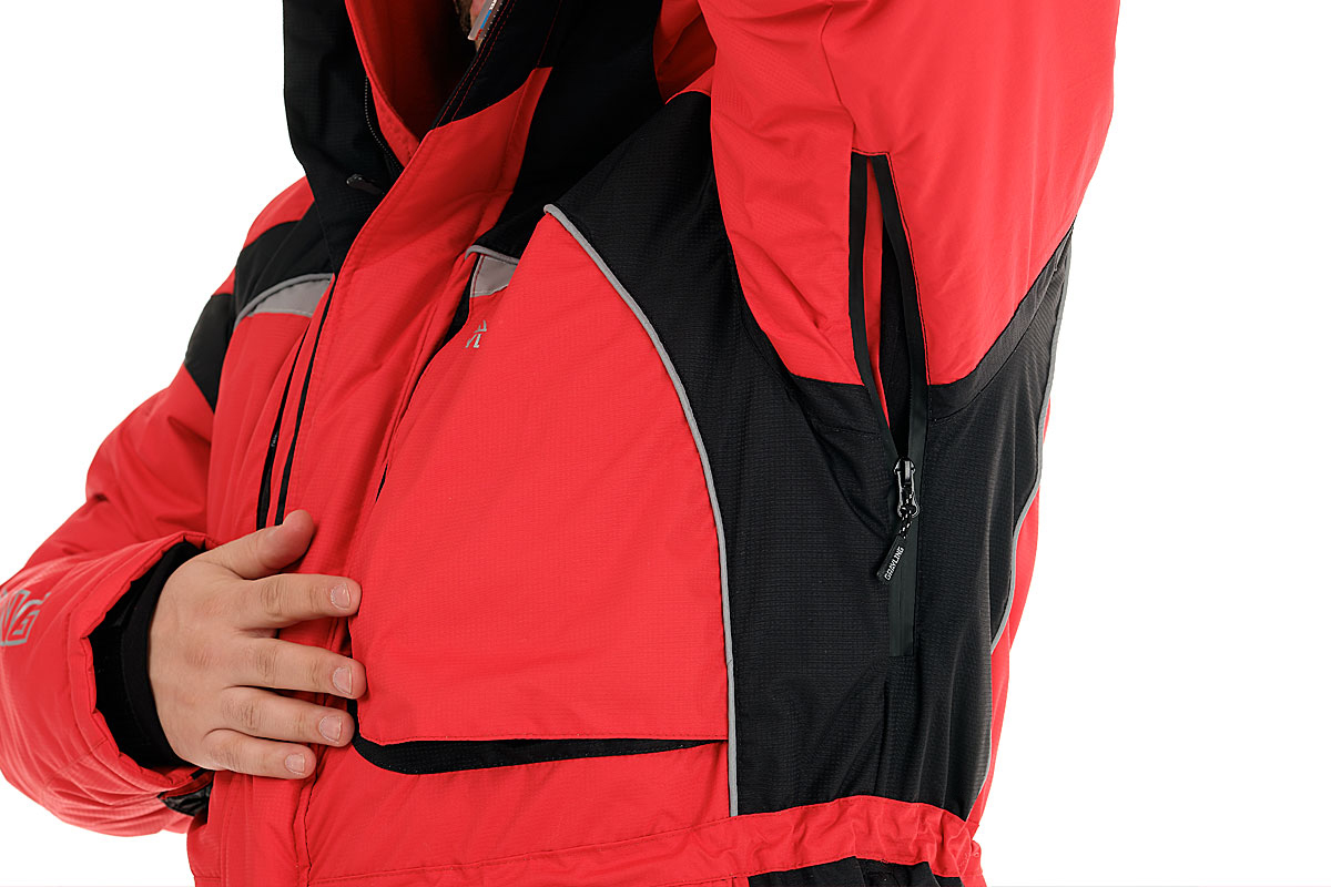 - Удлиненная куртка закрывается на двухбегунковую молнию и двойную ветрозащитную планку с магнитными кнопками. Объем по талии регулируется внутренней кулиской. Низ куртки можно увеличить по бокам за счет вставок на молнии и с комфортом рыбачить в положении сидя. Ветрозащитная юбка в растегнутом состоянии крепится кнопками к подборту. Высокий воротник утеплен флисом. Капюшон с козырьком пристегивается к куртке молнией, регулируется по краю лица и по объему головы.