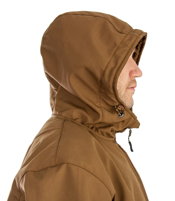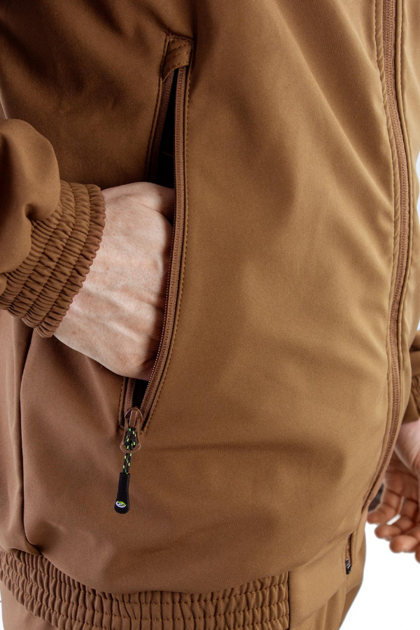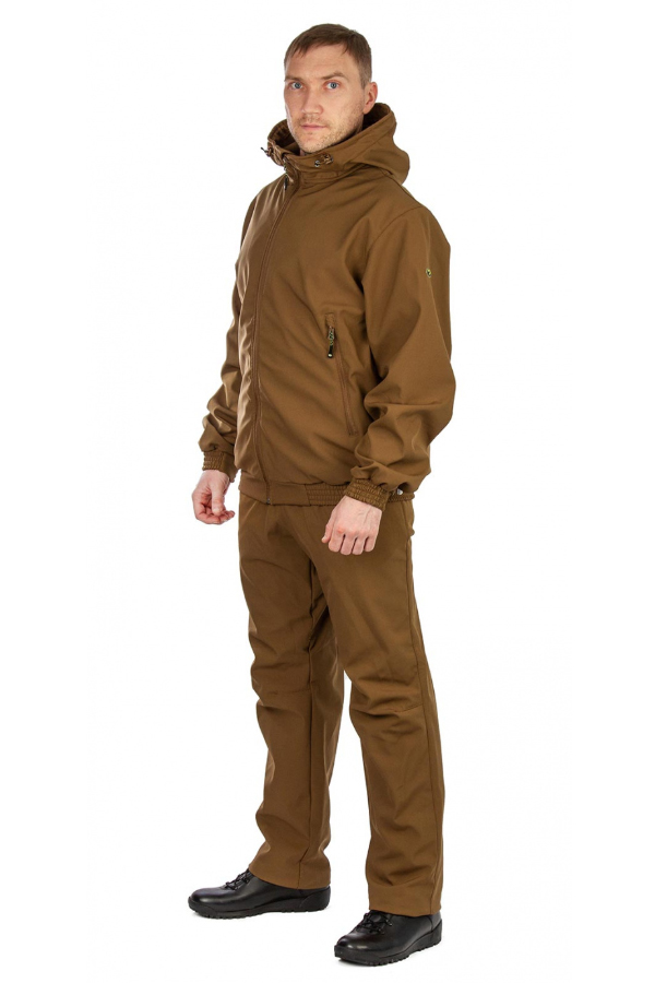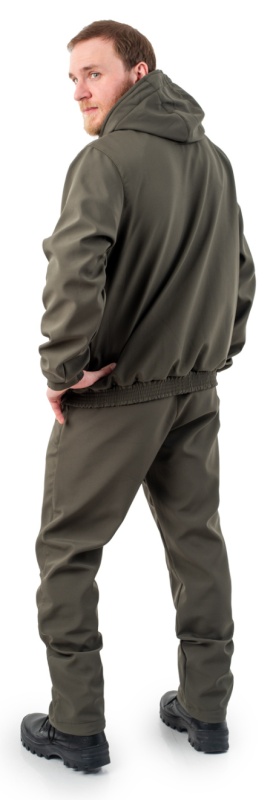 Костюм из полофлиса наделен ветрозащитой, хорошими теплоизоляционными свойствами. Материал практически не впитывает влагу, быстро сохнет, не вызывает аллергии. Укороченная куртка с капюшоном и воротником-стойкой застегивается на молнию, собрана на широкую простроченную резинку понизу, обеспечивая комфортное прилегание по бедрам. На рукавах имеются манжеты с широкой резинкой, которая не стягивает и не натирает кожу, а плотная посадка позволяет не пропускать ветер.