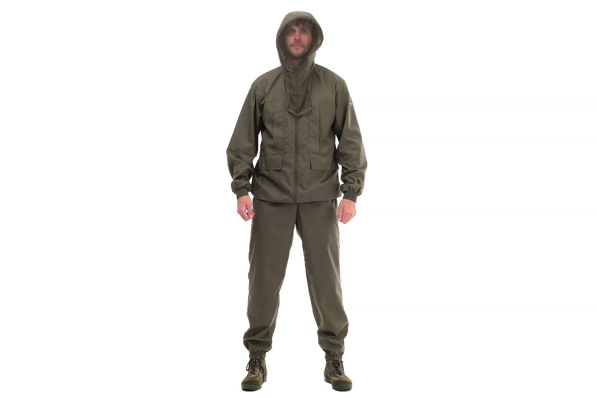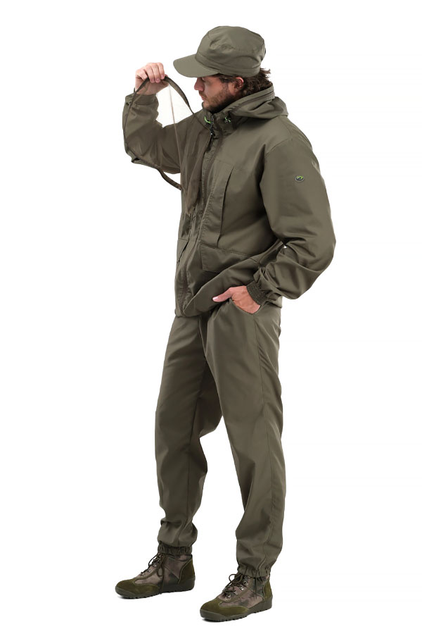 Удлиненная куртка по низу регулируется утяжками. Рукава куртки с манжетами плотно облегают руки, препятствуя проникновению насекомых. Капюшон регулируется по овалу лица шнуром. Антимоскитная сетка пристегивается к капюшону молнией и легко убирается в небольшой кармашек на груди. Широкие листочки четырех вместительных карманов защитят от попадания лесного сора.