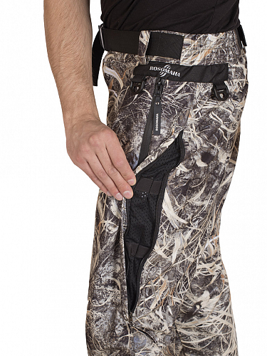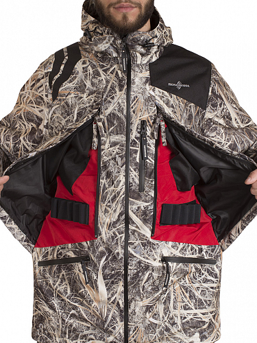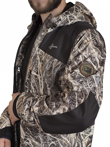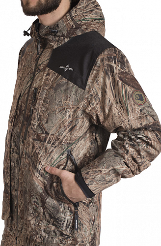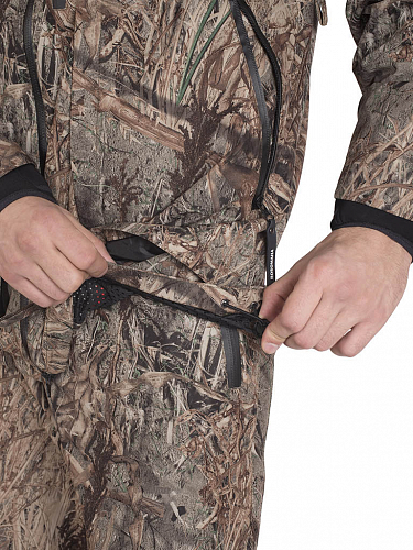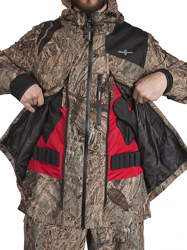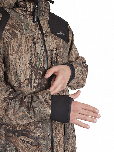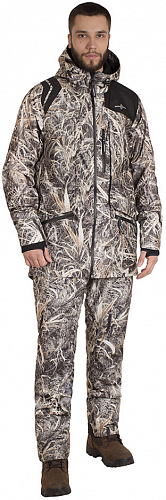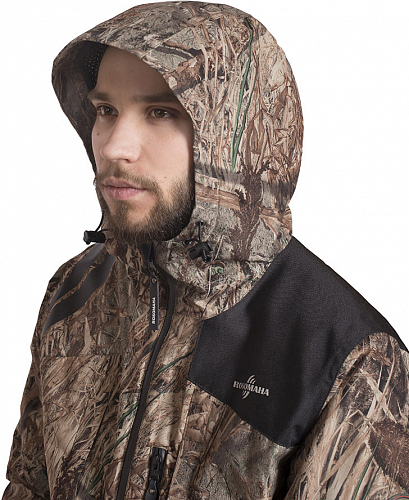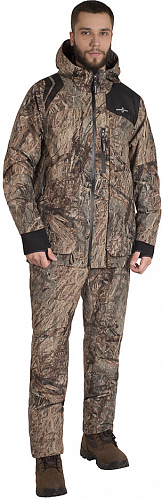 Современный костюм разработан специально для охоты. Продуманная конструкция с проклеенными швами сохраняет тепло и в то же время пропускает испарения от тела, создавая комфортный микроклимат. Костюм состоит из куртки и брюк. Куртка укороченная, спинка удлиненная. Низ куртки регулируется при помощи эластичной тесьмы. Имеется система защищенного хранения от осадков - на полочках под отлетными деталями расположены карманы под рацию, сотовый телефон, патронташи. Вентиляция в пройме рукавов. По низу рукавов неопреновые манжеты. Брюки на широком поясе, который регулируется по фигуре при помощи стропы с пряжкой. Задняя часть пояса собрана на резинку. Боковые карманы на "молнии". В боковых швах вентиляция на "молнии". По низу брюк предусмотрена регулировка по ширине - разрезы с "молниями".