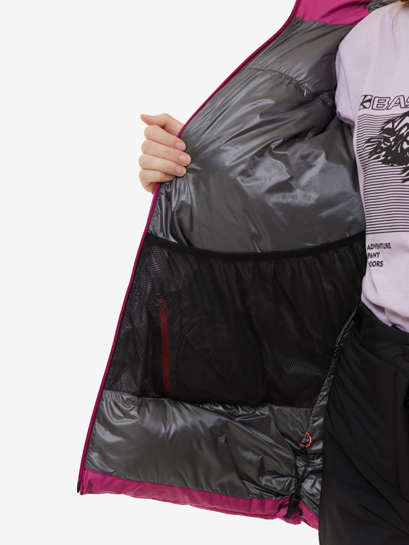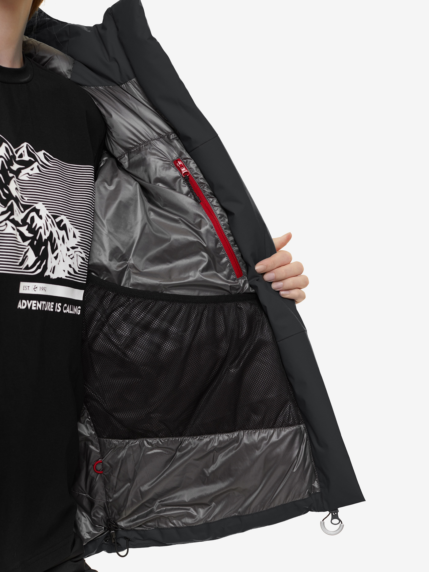 - два высоких теплых кармана по бокам куртки доступны и «под рюкзаком»;