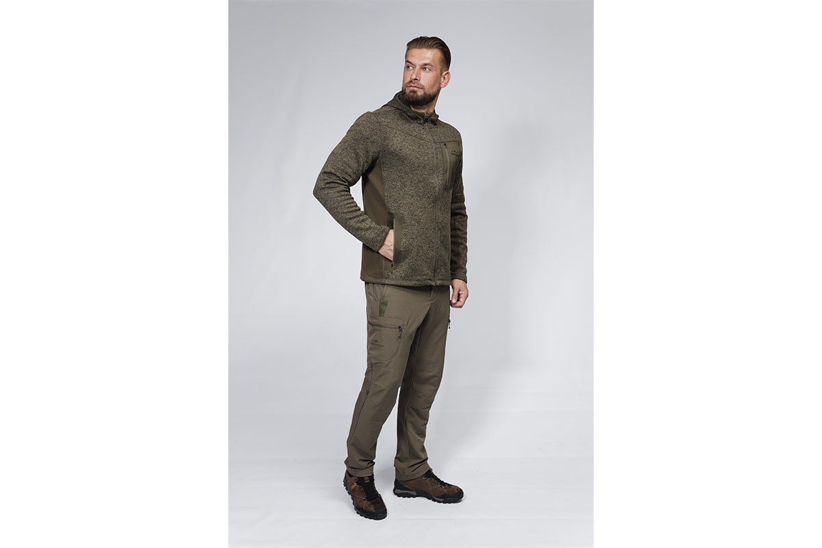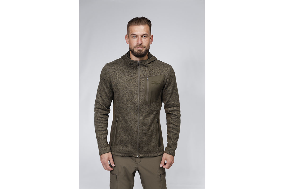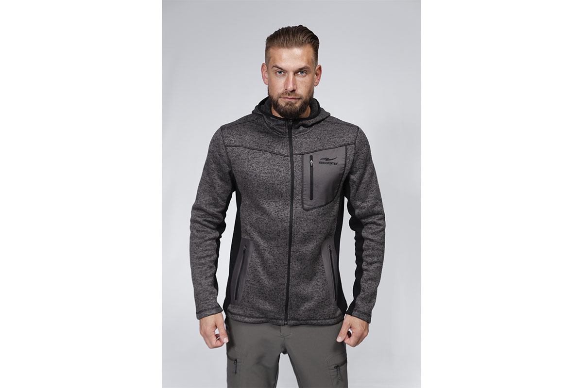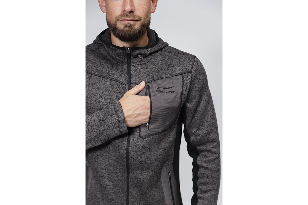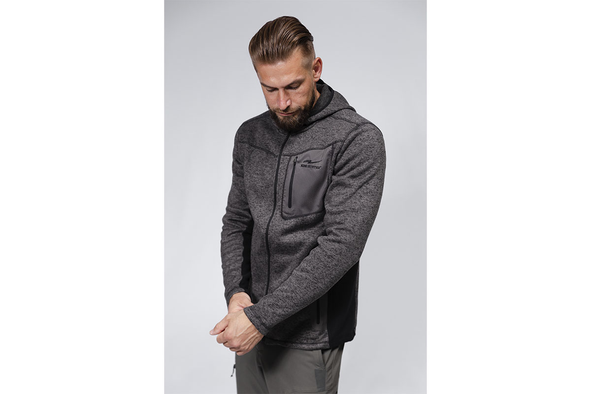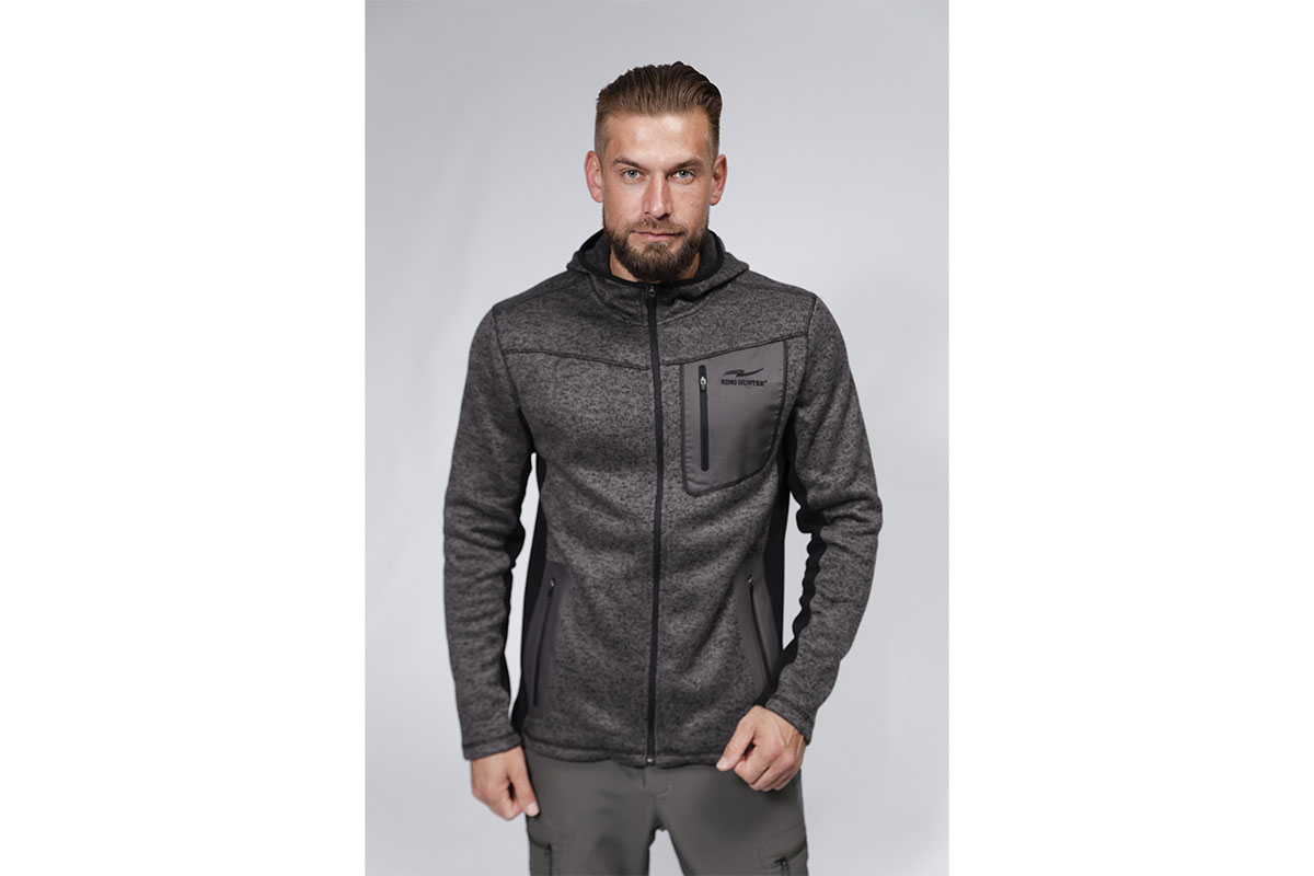 King Hunter Arctic Hood - флисовая куртка с капюшоном из ткани с вязанной текстурой. Анатомический крой куртки не стесняет движений. Теплая и комфортная, может служить в качестве утепляющего слоя одежды в холодное время года, так и быть самостоятельной верхней одеждой. Эластичные вставки на боковых частях придают дополнительный комфорт при использовании в качестве второго слоя одежды.