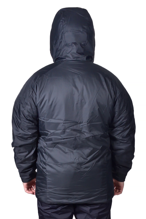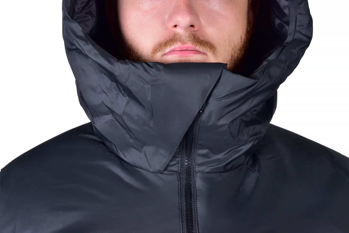 Куртка имеет глубокий утепленный капюшон с высокой воротниковой зоной, который надежно прикрывает голову, лицо и шею от холодного ветра, метели и влаги от талого снега. Защищенная молния в области подбородка изолирована тканью куртки, предотвращая неприятные соприкосновения с остывшим металлом. Липы на манжетах позволяют регулировать ширину рукавов, защищая руки от холода и снега.