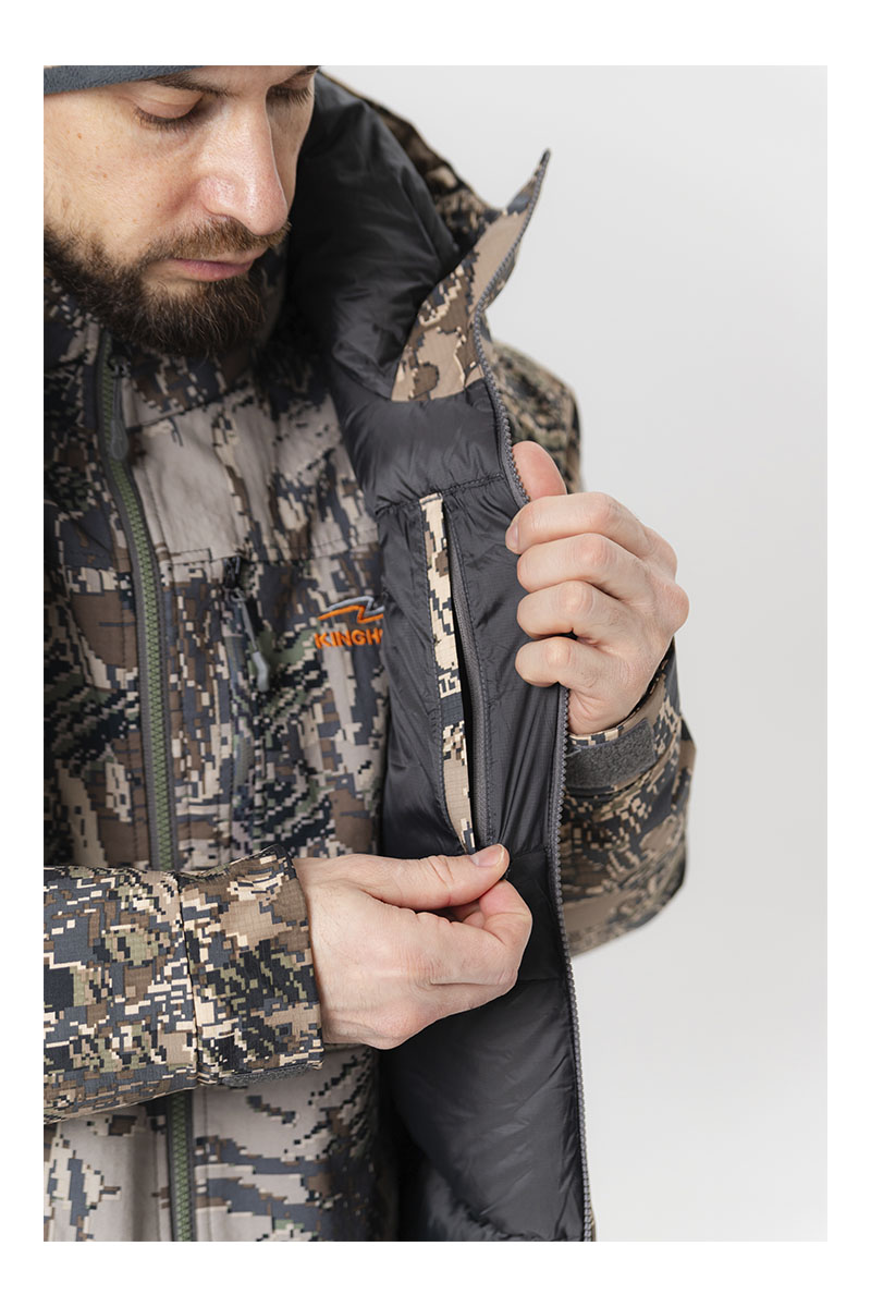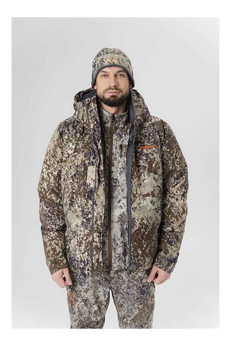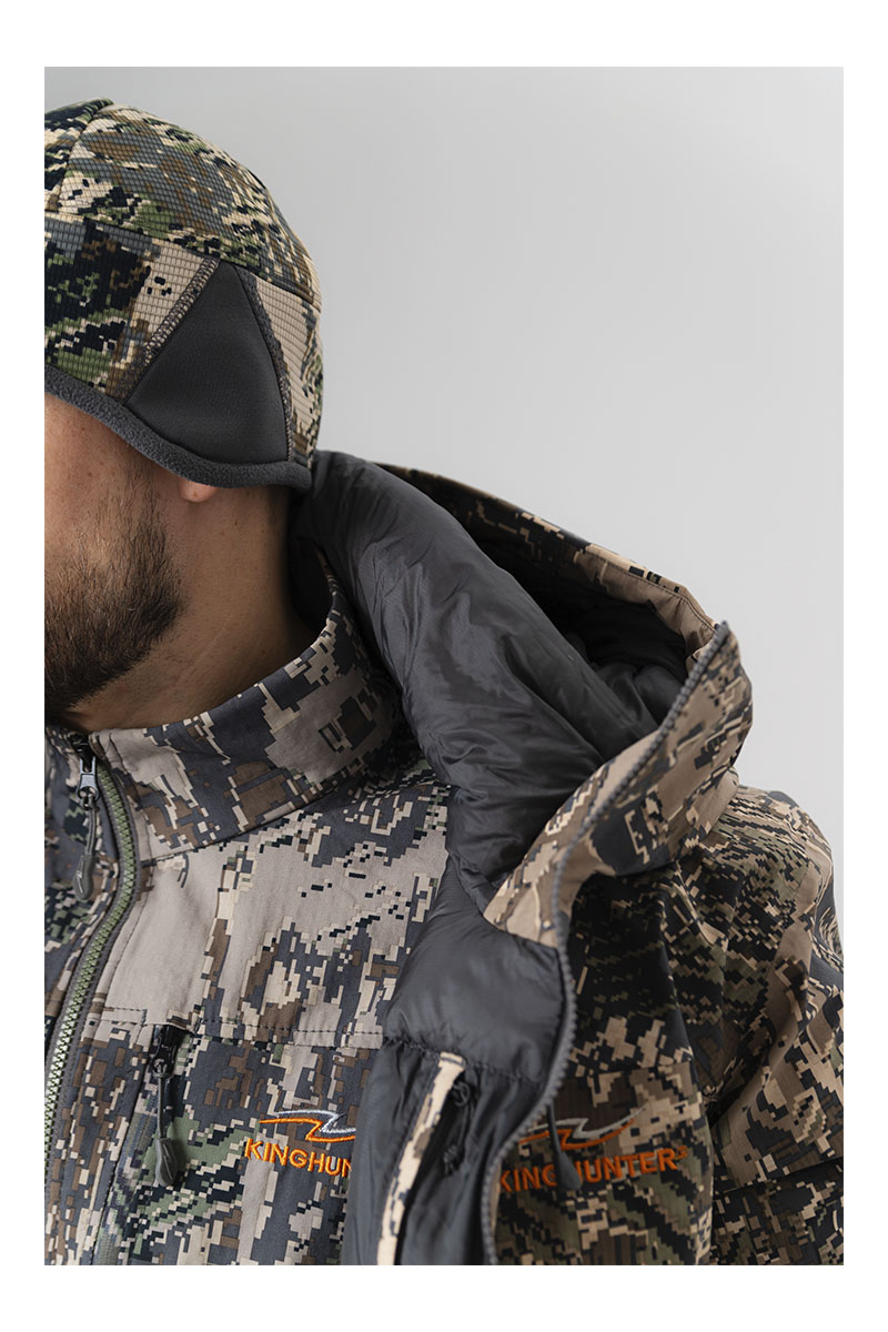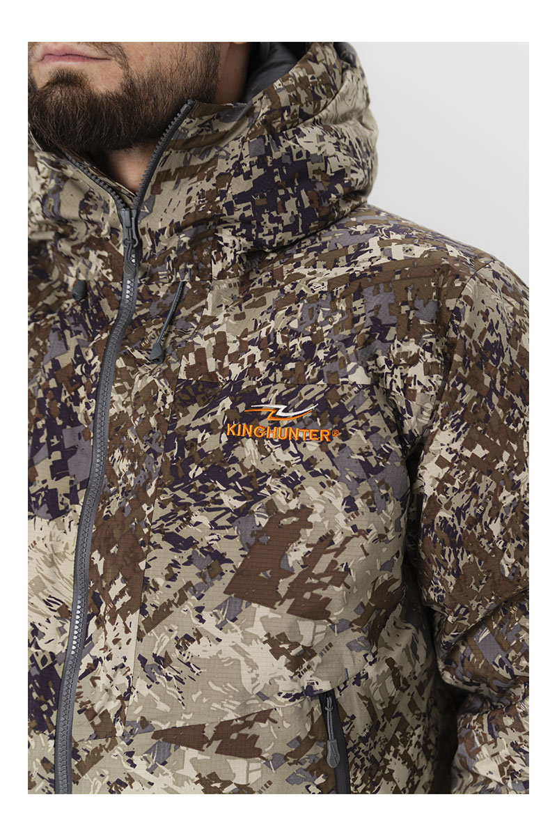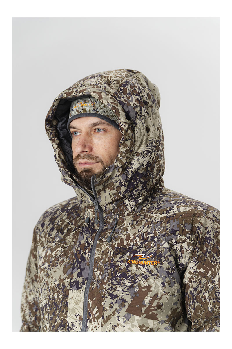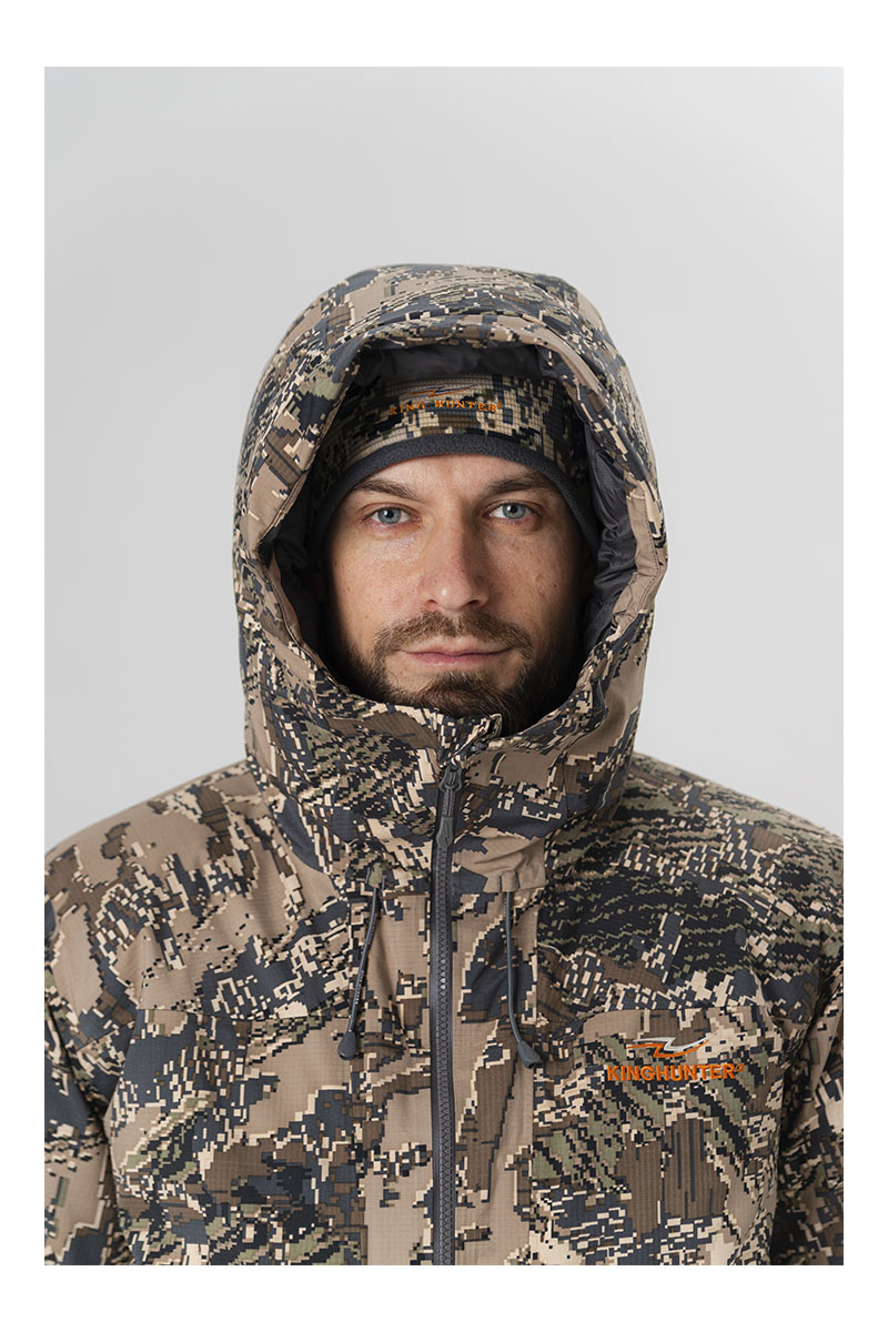 Пуховая куртка King Hunter SHELTER. Самая тёплая и компактная куртка в линейке. Это экипировка для охоты в условиях, когда мороз, ветер и снег бьют без пощады, а движение минимально. Парка держит тепло на «номере», в засидке или при долгом ожидании, не теряя компактности и лёгкости в переноске.