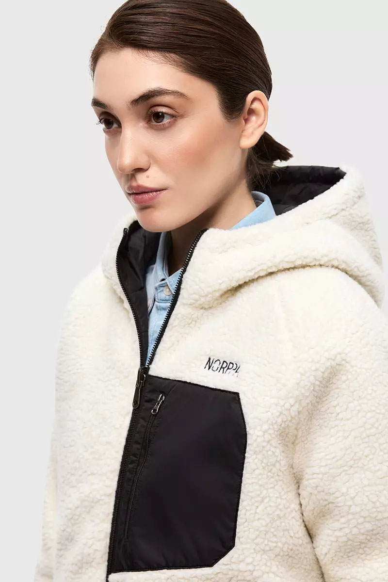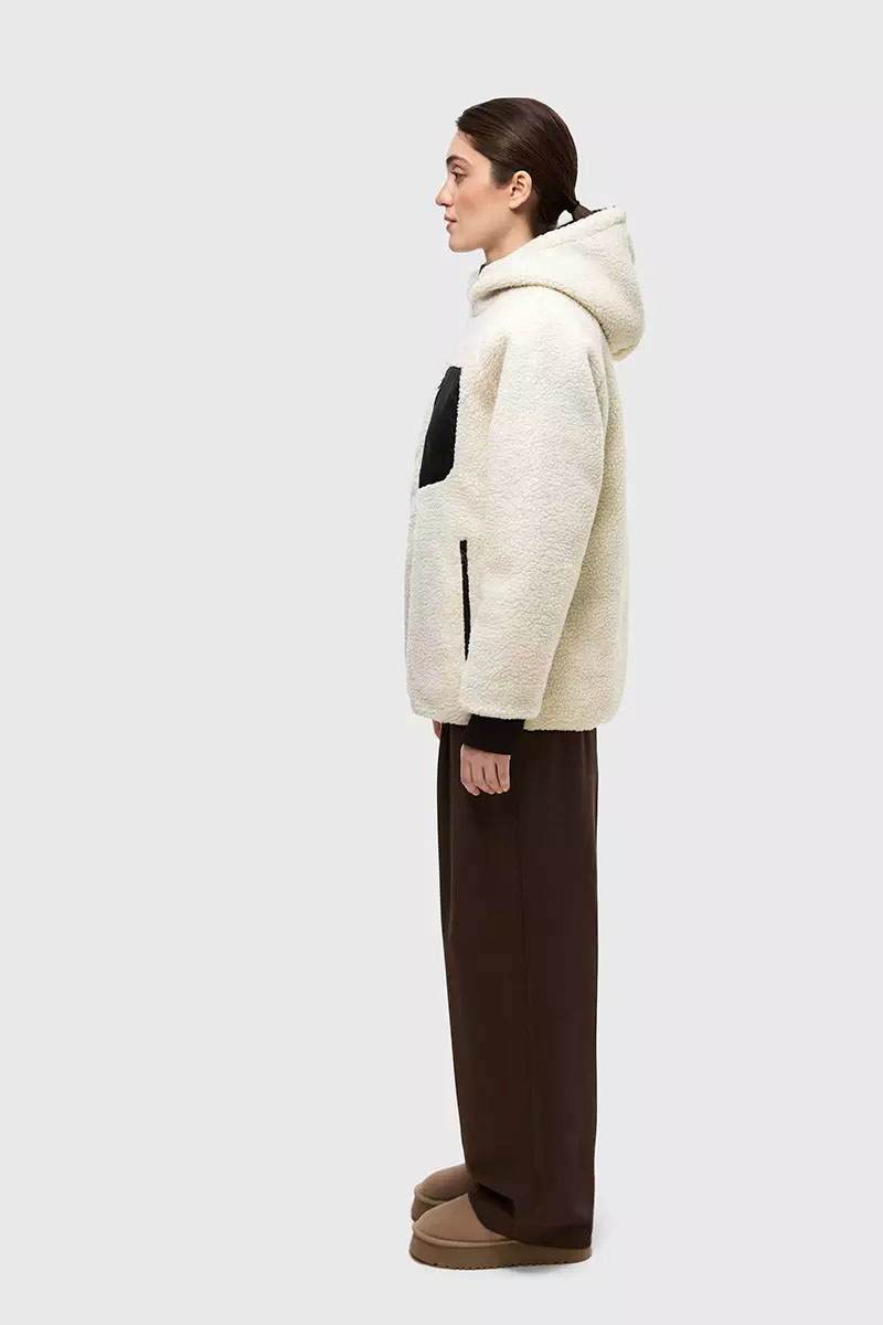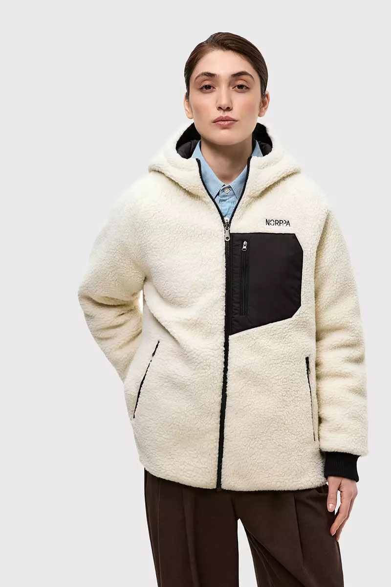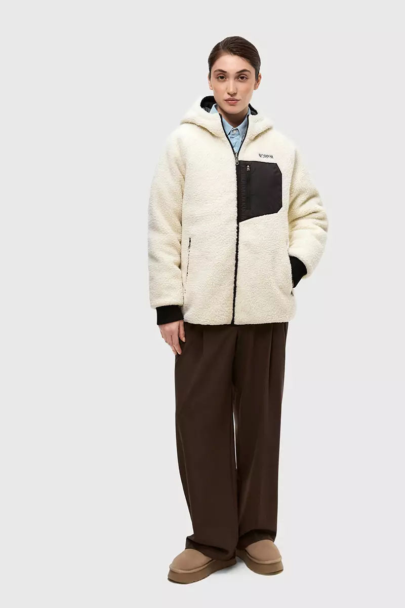 Куртка представляет собой двустороннюю модель. Внешняя сторона выполнена из мягкой шерпы, внутренняя — из непродуваемого материала со стежкой. Ткань имеет дополнительную водоотталкивающую пропитку. Прямой крой создает свободную посадку.
