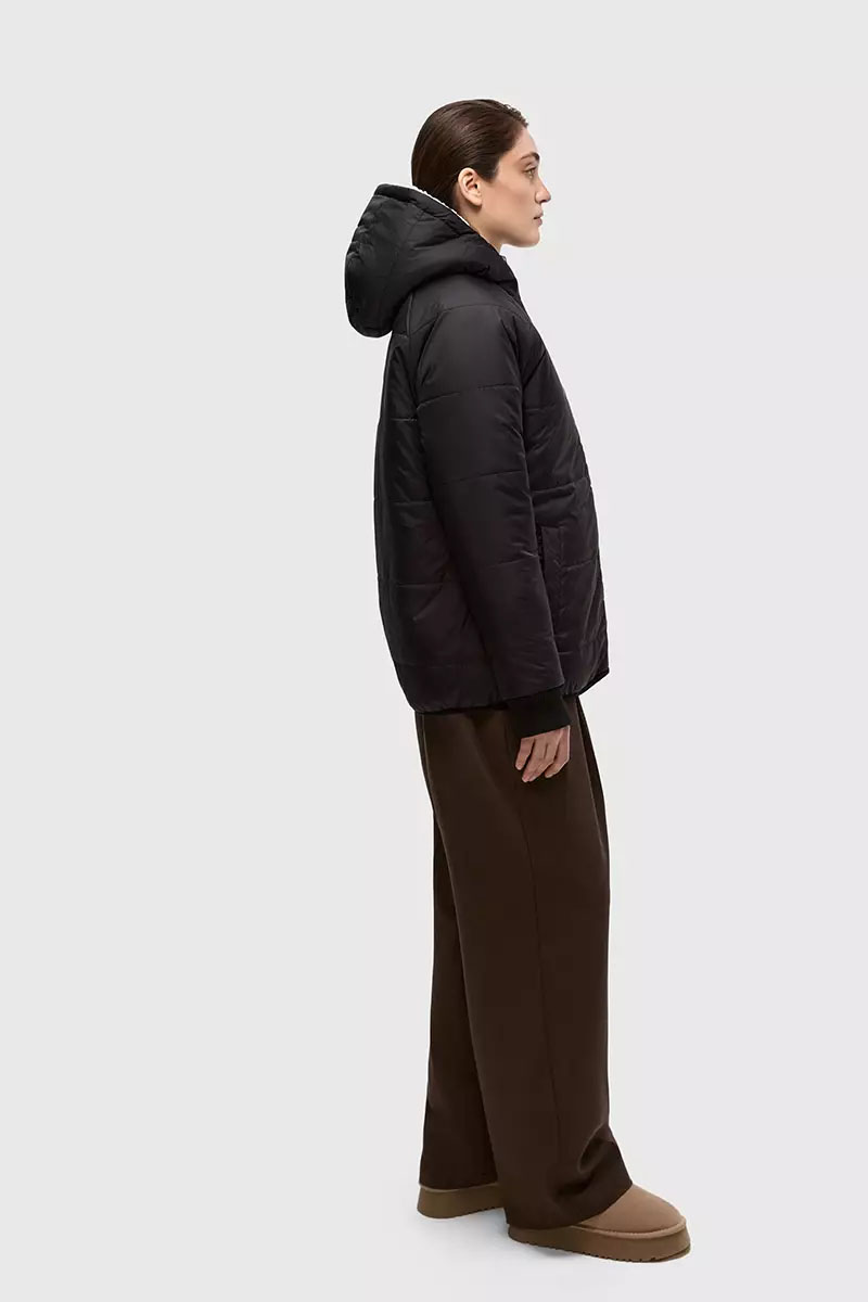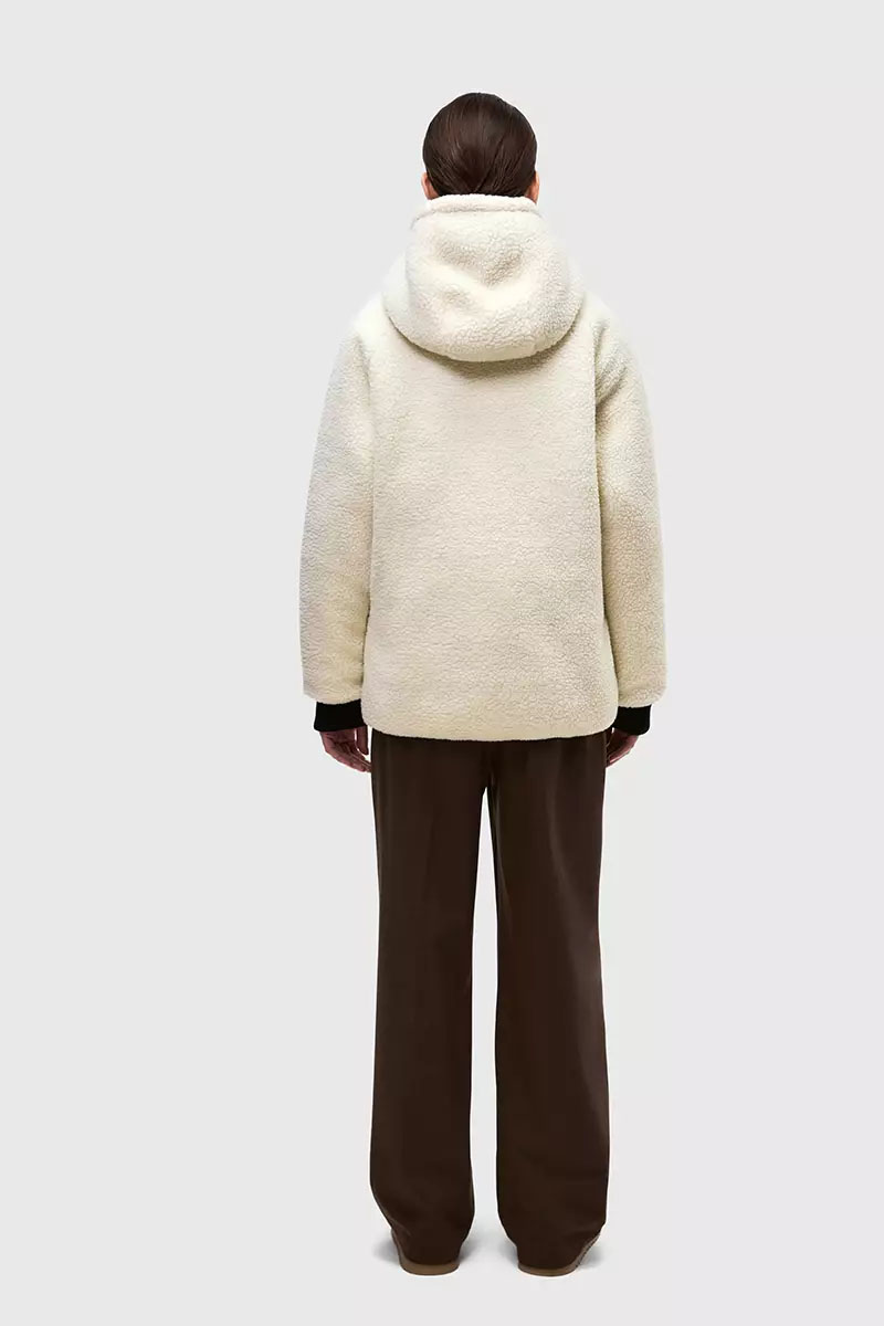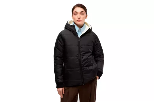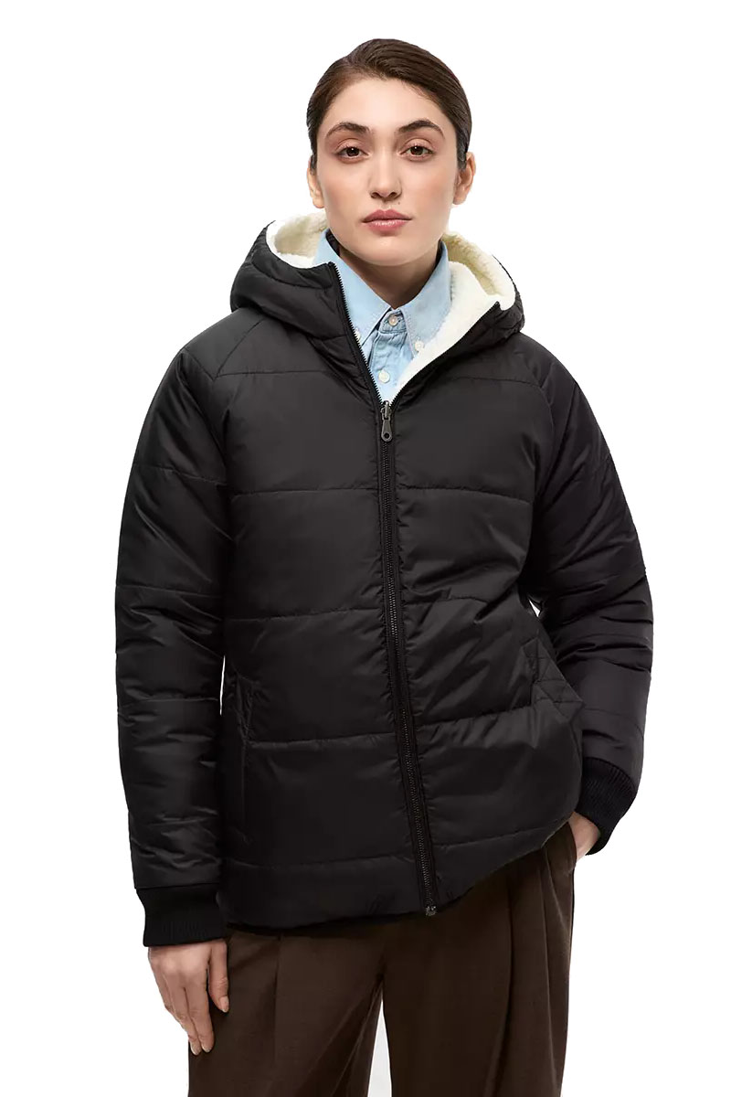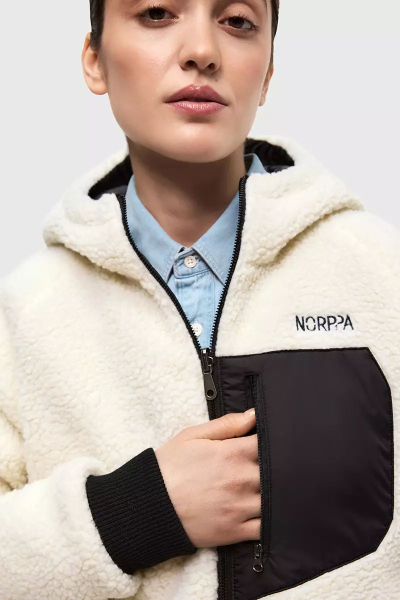Куртка представляет собой двустороннюю модель. Внешняя сторона выполнена из мягкой шерпы, внутренняя — из непродуваемого материала со стежкой. Ткань имеет дополнительную водоотталкивающую пропитку. Прямой крой создает свободную посадку.