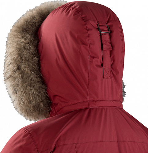 Отстегивающийся теплый регулируемый капюшон с регулировкой по высоте и по лицу в кулиске. Опушка из меха финского енота, пристегивающаяся на молнии. |