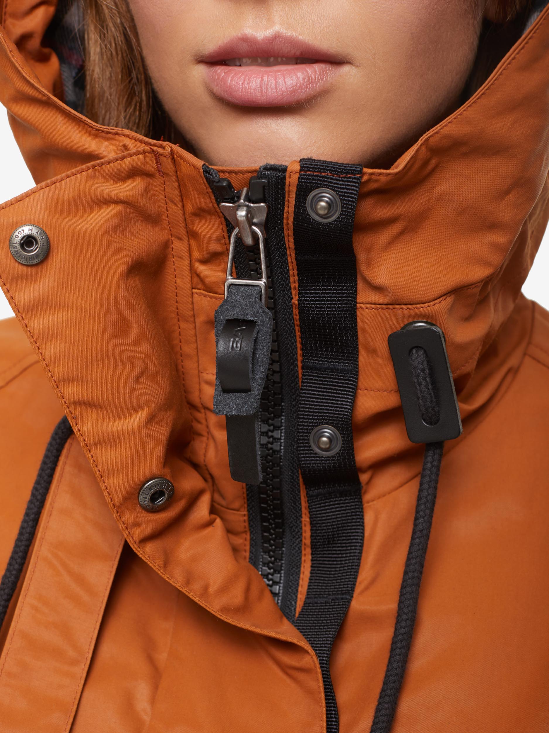 - объемный капюшон с ветрозащитным тубусом, регулируется по объему кулиской и патой;