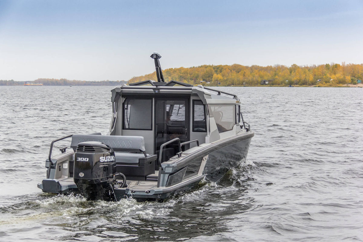 Лодка VOYAGER 850 Cabin имеет каюту с тремя спальными местами, гальюн и кухонный блок, в который входит холодильник и мойка. Модель рассчитана на установку подвесного двигателя мощностью до 450 л.с. Грузоподъемность лодки составляет до 1500 кг. Конструкция выполнена из материалов, применяемых в судостроении. Корпус обладает остойчивой формой.