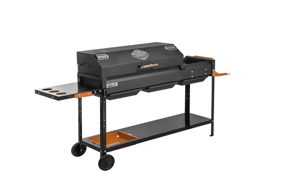 Мангал Helios Smart-1200 Премиум включает в себя жаровню с перфорированным дном, 3 съемных зольника, боковой столик с 3-мя подстаканниками, полку с лотком, держатель инструментов, крышку для приготовления блюд на гриле, а также колеса и боковую ручку для удобства перемещения мангала. В жаровне предусмотрены отверстия в днище, которые обеспечивают доступ воздуха к углям, что значительно облегчает их розжиг и способствует их быстрому разгоранию. На продольных стенках жаровни выполнены ребра жесткости, которые практически исключают деформацию мангала при нагреве. Жаровня мангала окрашена термостойкой краской, которая выдерживает нагрев до 1000°С. Фигурные вырезы в стенках жаровни (по краю) дают возможность регулировать положения шампуров.