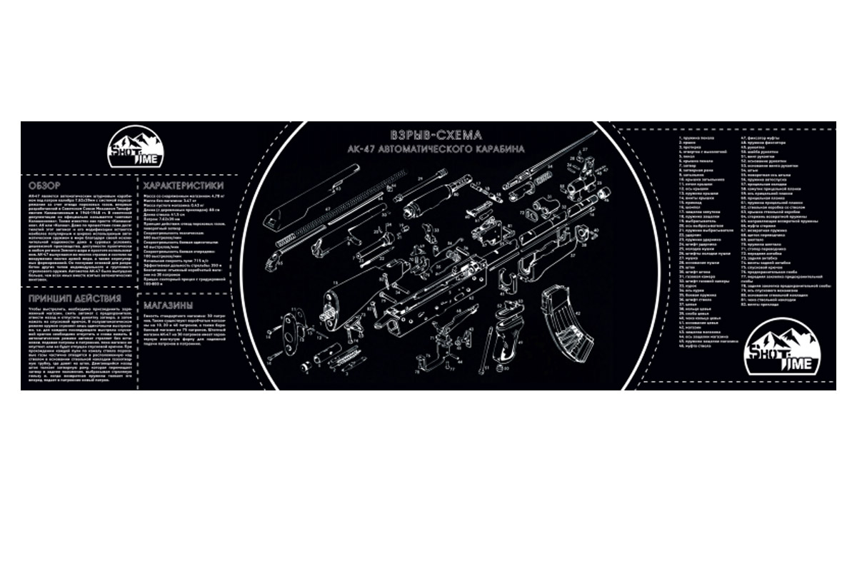 - Детализированная взрыв-схема по центру коврика иллюстрирует механику АК-47, предоставляя полезную информацию о составных частях оружия.