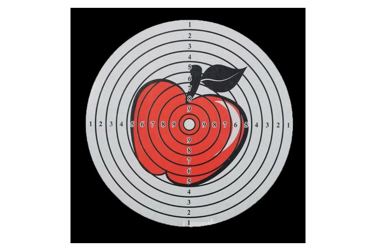 Радиус мишени 6 см, радиус кружка "десятки" 6 мм, расстояние между окружностями по 6 мм. Отличается от обычной спортивной мишени тем, что вместо черного круга в центре нарисована фигура яблока красного цвета, в которую и нужно осуществляеть прицеливание. Количество мишеней в упаковке: 50 штук.