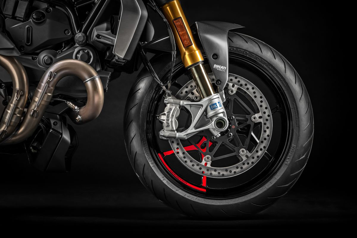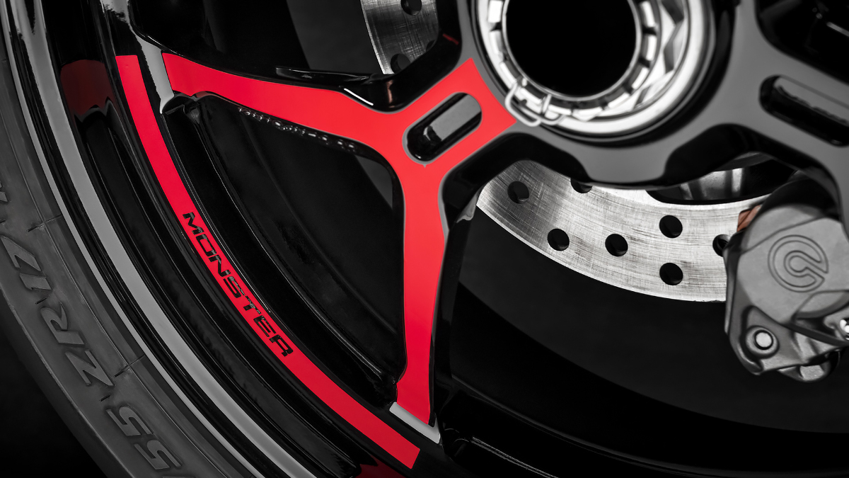 На Monster 1200 установлен крепкий литой односторонний маятник из алюминия, который обеспечивает высокую устойчивость, сниженный вес и превосходную стабильность, а также придаёт облику мотоцикла более техничный и профессиональный вид.