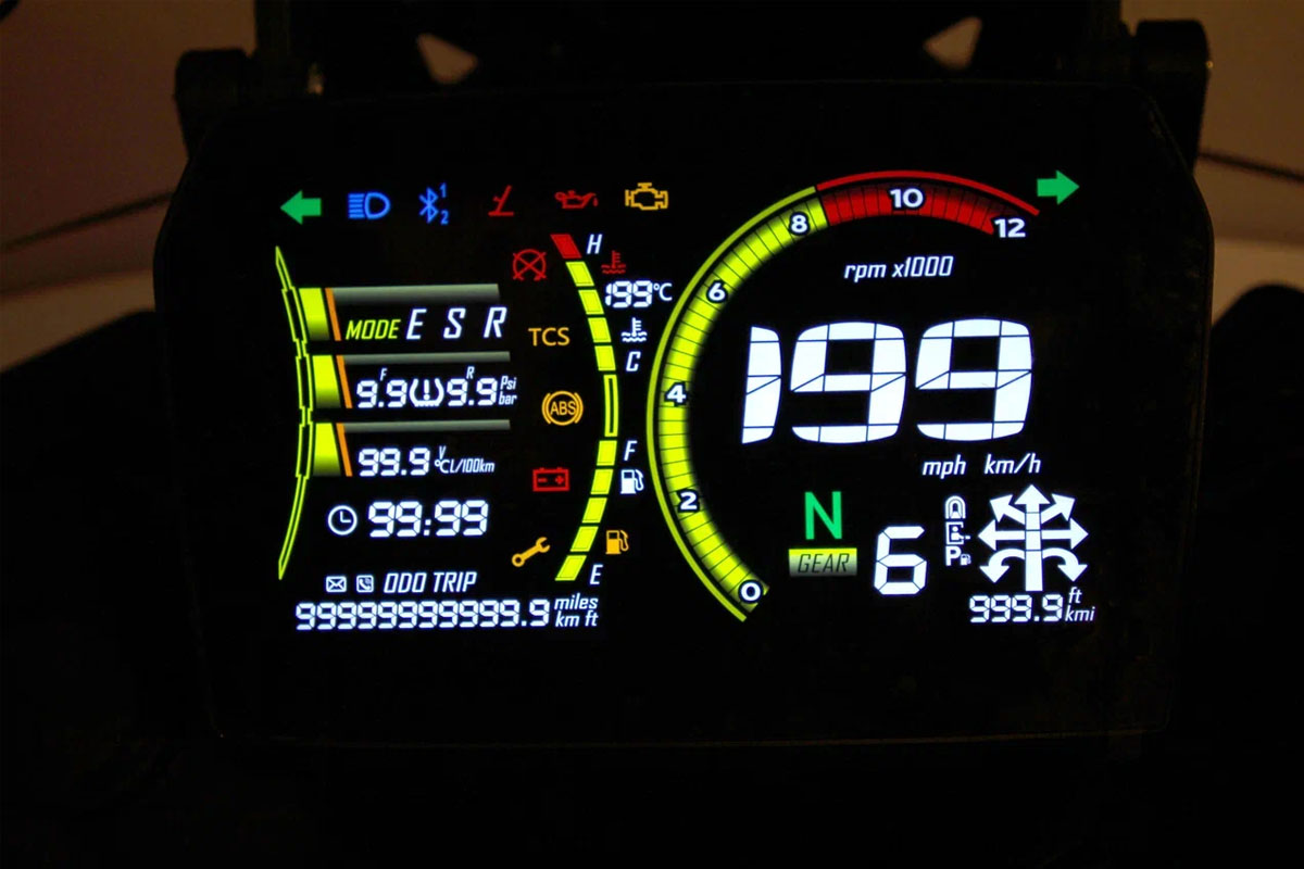 - Тормоза (передние): Два диска, радиальные суппорты Nissin, ABS (с возможностью отключения заднего контура)
