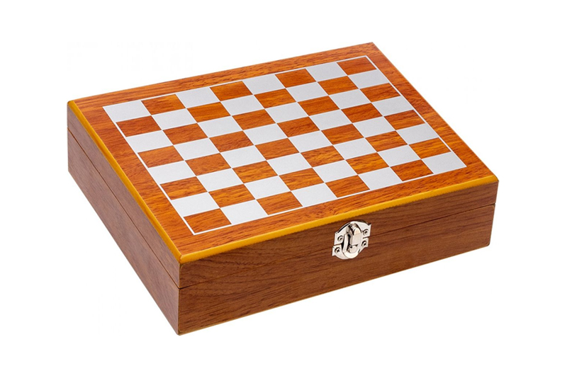 Подарочный набор Helios HS-GT-TZ201 в деревянном чемодане, который сделан из лакированного дерева, внутри бархатная подложка. Чемодан закрывается на защелки, имеет удобную ручку. В крышке расположен набор для игры в шахматы. На крышке изображена шахматная доска. Фляжка и стопки выполнены из нержавеющей стали, декорированы искусственной кожей.