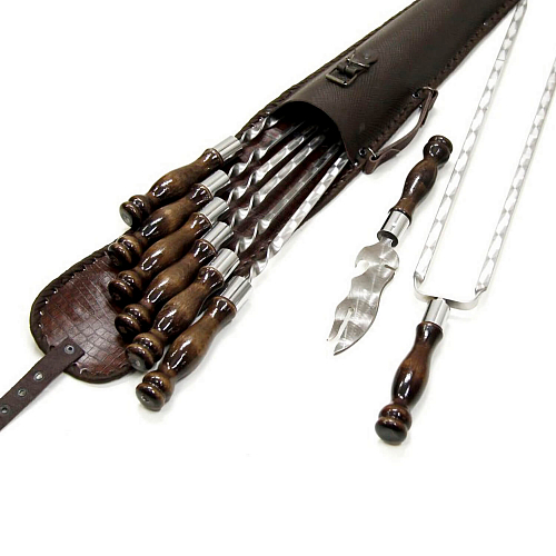 Отличный набор шампуров в чехле из кожи, который будет желанным подарком для любого мужчины! Это не подарочная вещь, судьба которой пролежать всю жизнь на полке, а настоящий профессиональный инструмент. Все шампуры снабжены ручками из бука, которые покрыты качественным лаком. Для защиты от негативных условий все рукояти снабжены защитным кольцом, которое крепится непосредственно к лезвию при помощи заклепки.