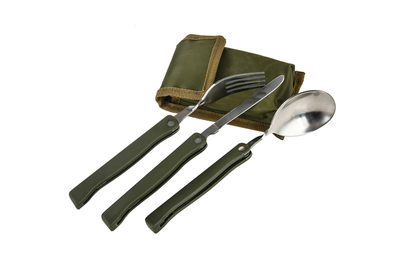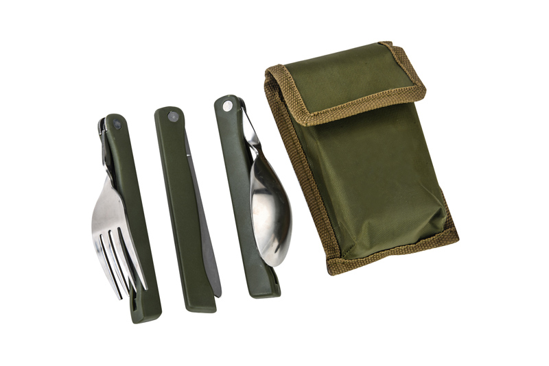 Складной набор столовых приборов в компактном чехле на липучке: 3 предмета – ложка, вилка и нож. За счет компактности и специального крепления полевой набор легко поместится не только в армейской сумке или рюкзаке, но и просто на поясе.