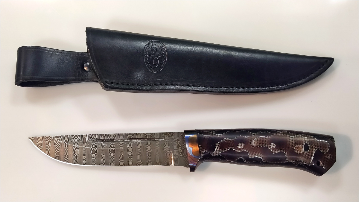 - Комплектация: В комплект входят кожаные ножны, сертификат о том, что нож не является холодным оружием, паспорт изделия и мягкий текстильный кейс с логотипом компании.