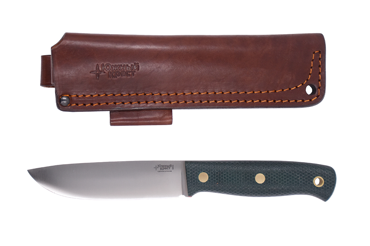 Рукоять выполнена из микарты — это конструкционный композитный материал, представляющий собой слоистый пластик на основе ткани и полимерного связующего вещества. Он прочный, не впитывает ни воду, ни запахи, тактильный и высоко декоративный. Кроме того, текстолит хорошо переносит значительные перепады температуры. Нож комплектуется ножнами из натуральной кожи скандинавского типа, которые имеют два варианта подвеса: свободный при помощи подвесной петли и жестко закрепленный на поясе.