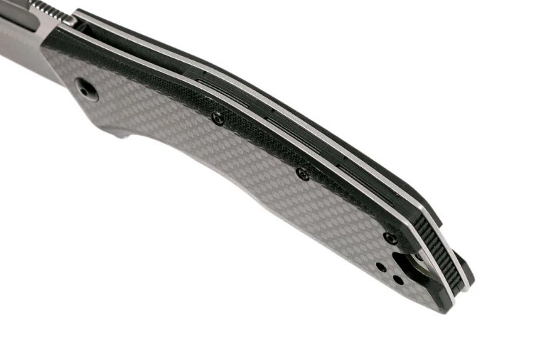 Рукоять ножа выполнена из материала G10/Carbon, который не только прочен, но и не выцветает. Толщина обуха составляет 2.5 мм, что позволяет резать с уверенностью. Твердость стали находится в диапазоне 57-58 HRC, что гарантирует сохранение остроты заточки.