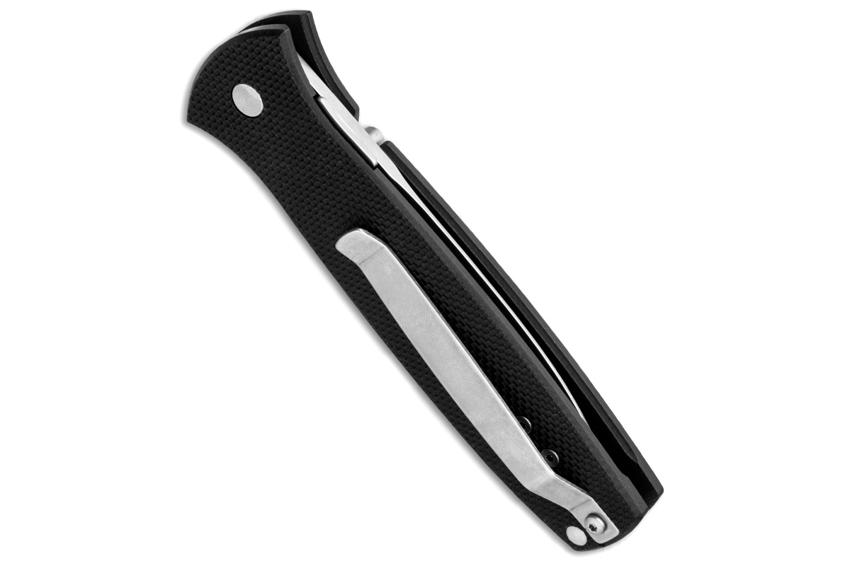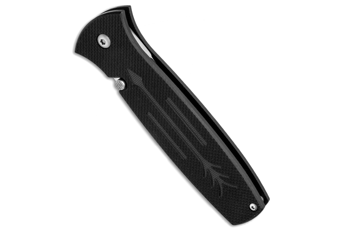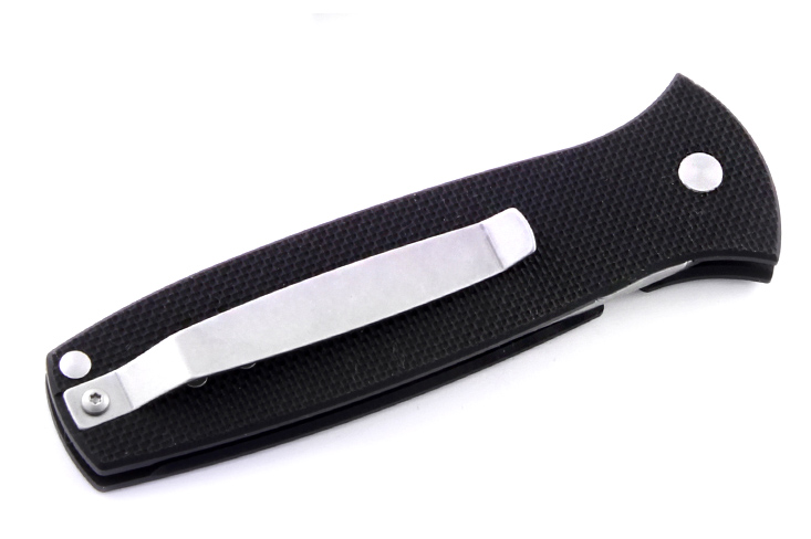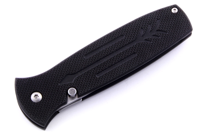 Шпенек на клинке односторонний. Он держится на торксе и его можно переставить под левую руку. Сложиться клинку во время работы не дает конструктивно простой, но надежный линейный замок Liner-Lock. Весит нож Ontario OKC Dozier Arrow SP всего 82 грамма. Такой малый вес достигается благодаря отсутствию одного лайнера и облегчения другого. Накладки рукояти выполнены из текстурированного стеклотекстолита G-10. Нож снабжен несъемной стальной клипсой. Отверстие для темляка отсутствует.
