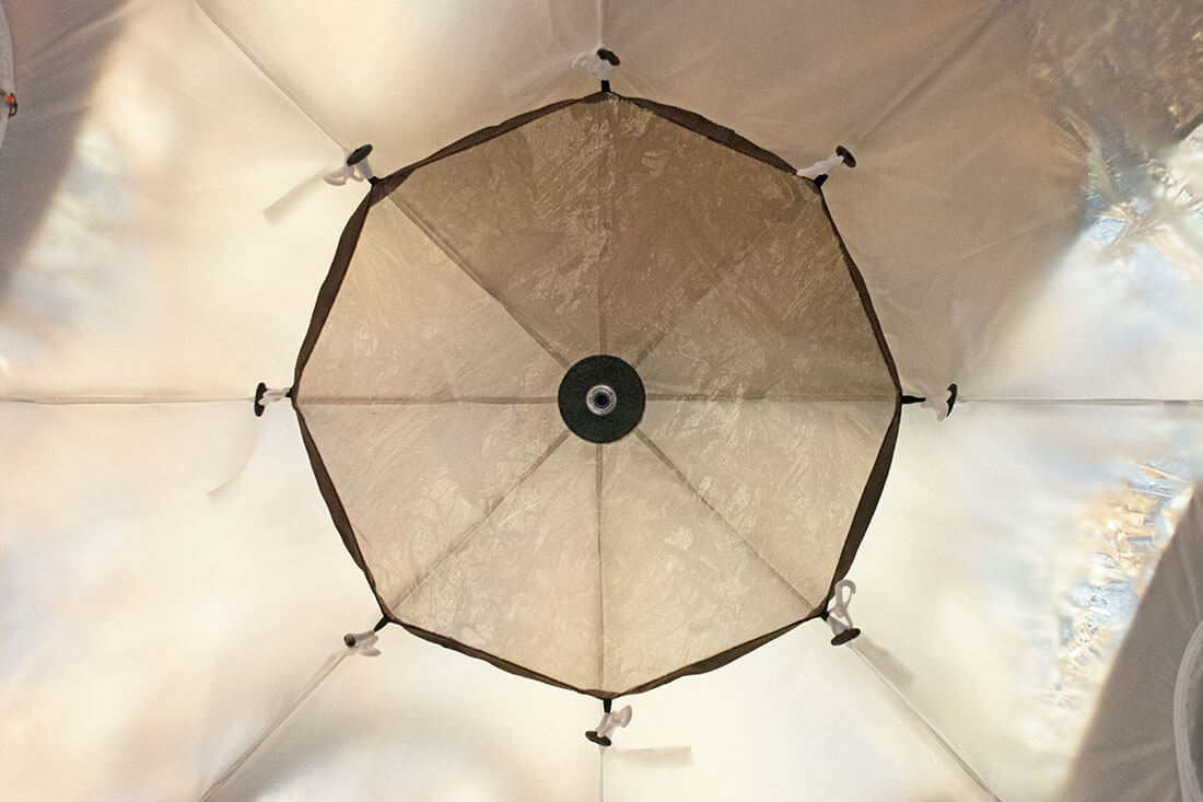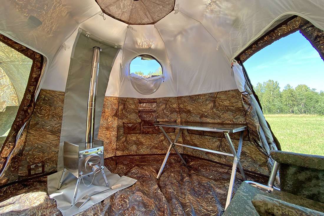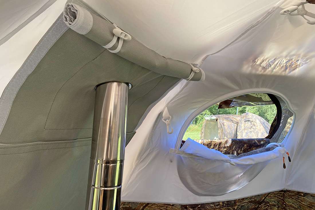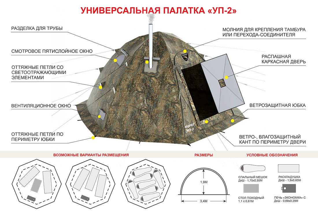 Возможность отопления. Палатка с тамбуром Берег УП-2 является всесезонной, что позволяет использовать жилой модуль совместно с печами длительного горения. Для максимальной безопасности, стенка внутри палатки (в месте установки печи) оборудована съемной термостойкой тканью, способной выдерживать температуру до +1200 °C. Разделка дымохода в крыше палатки Берег УП-2 представляет собой вставку из термостойкой ткани с кольцом из нержавеющей стали. Такая конструкция исключает возможность контакта горячей трубы с тканью палатки, увеличивая пожаробезопасность палатки. Термостойкая ткань с силиконовой пропиткой не подвержена воздействию влаги, не поддерживает горение.