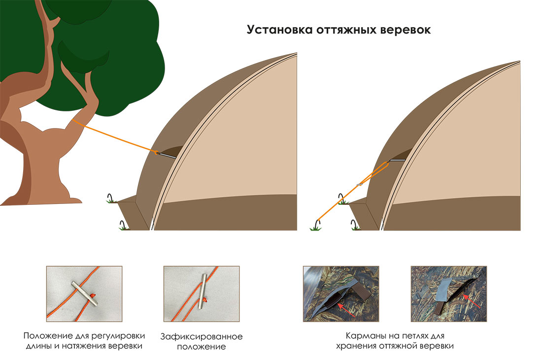 Светоотражающие оттяжки предусмотрены по периметру внешнего тента для безопасной стоянки и более удобного обнаружения палатки ночью. Треугольная форма создает большую площадь крепления к тенту, повышая ее надежность. В оттяжке есть карман для складывания веревки.