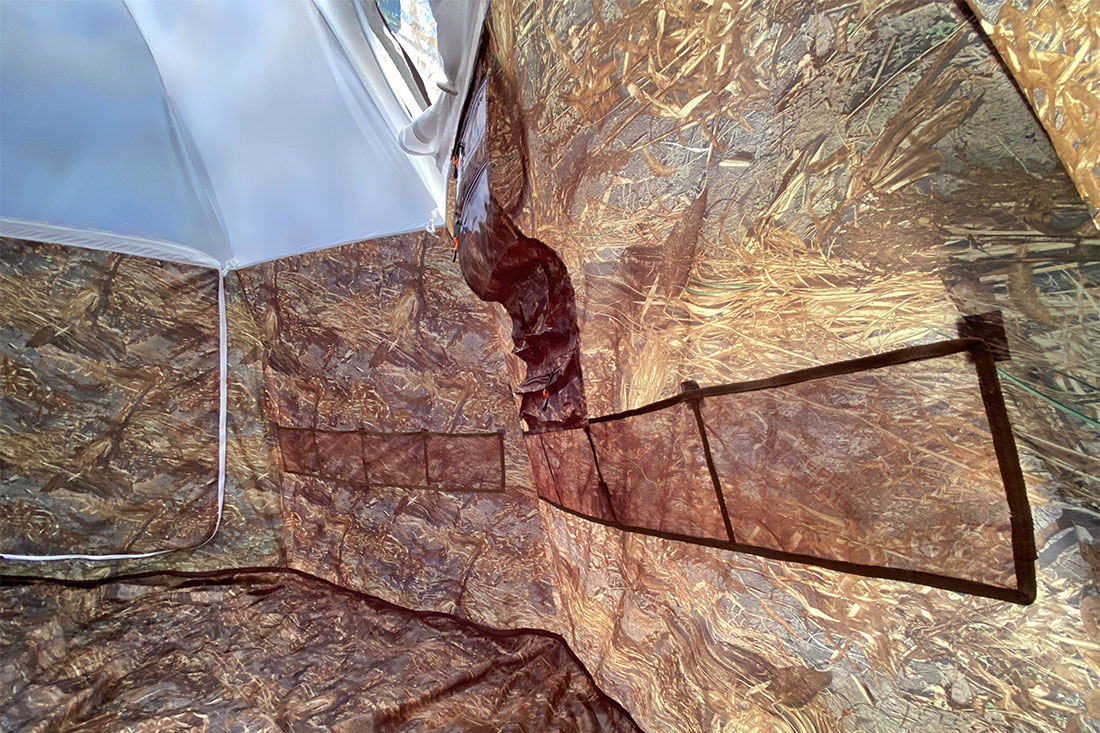 Многофункциональные окна палатки УП-2 состоят из нескольких слоев: защитный клапан с жесткой опорой на липе со стороны внешнего тента, оконное заполнение из прозрачной морозостойкой силиконовой пленки (температура использования до - 50 °C), внешний тент на молнии, антимоскитная сетка на молнии, внутренний тент на молнии.
