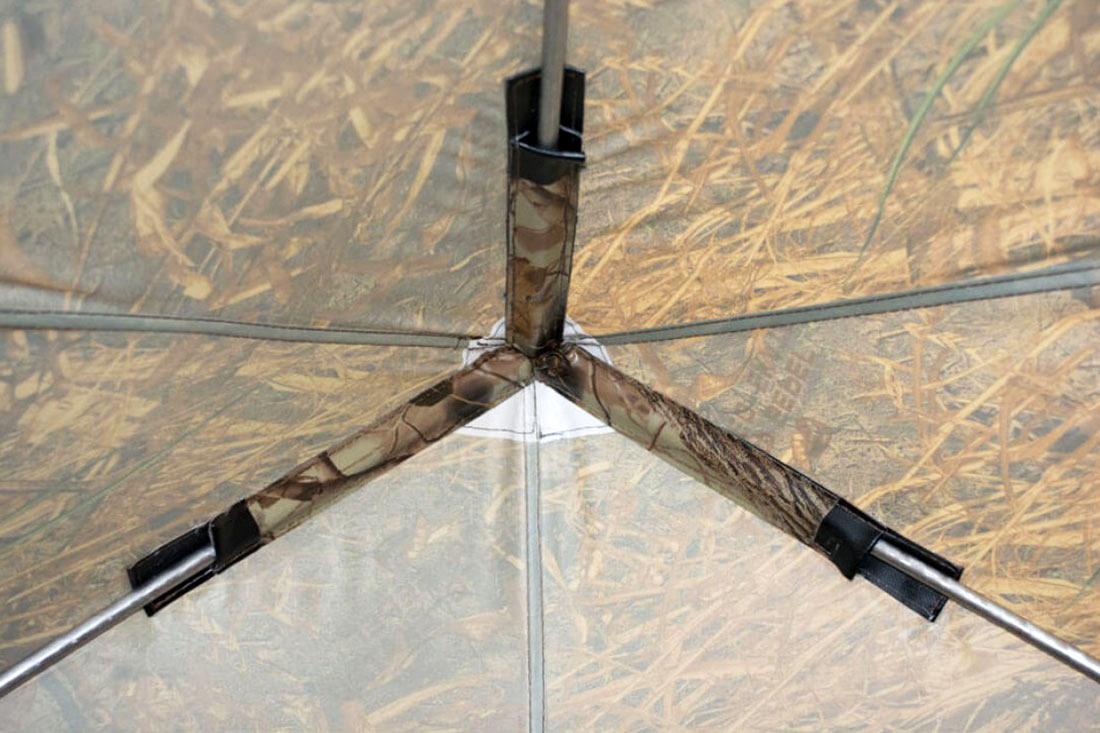 - Прутки каркаса установлены в углах со специальной усиленной стропой из материала ПВХ. В местах расположения механизмов раскрытия («хабов») установлены дополнительные усиливающие, закрывающие механизм, вставки.